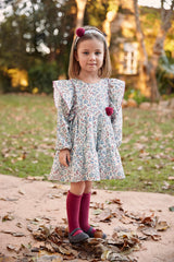 RITMO combina punto tricot color fucsia con tejidos estampados de flores pequeñas en una paleta suave y armoniosa. Es una colección pensada para coordinar, con conjuntos, vestidos y jesusitos que destacan por sus cuellos fruncidos, siluetas con vuelo y acabados cuidados.