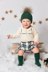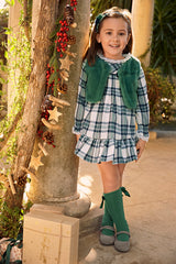La colección SINFONÍA combina cuadros en tonos verdes con punto tricot liso para crear conjuntos coordinados, cómodos y llenos de encanto. Incluye vestidos, conjuntos de short y camisa, peleles, ranitas y jerséis con motivo de osito aplicado en el delantero.
