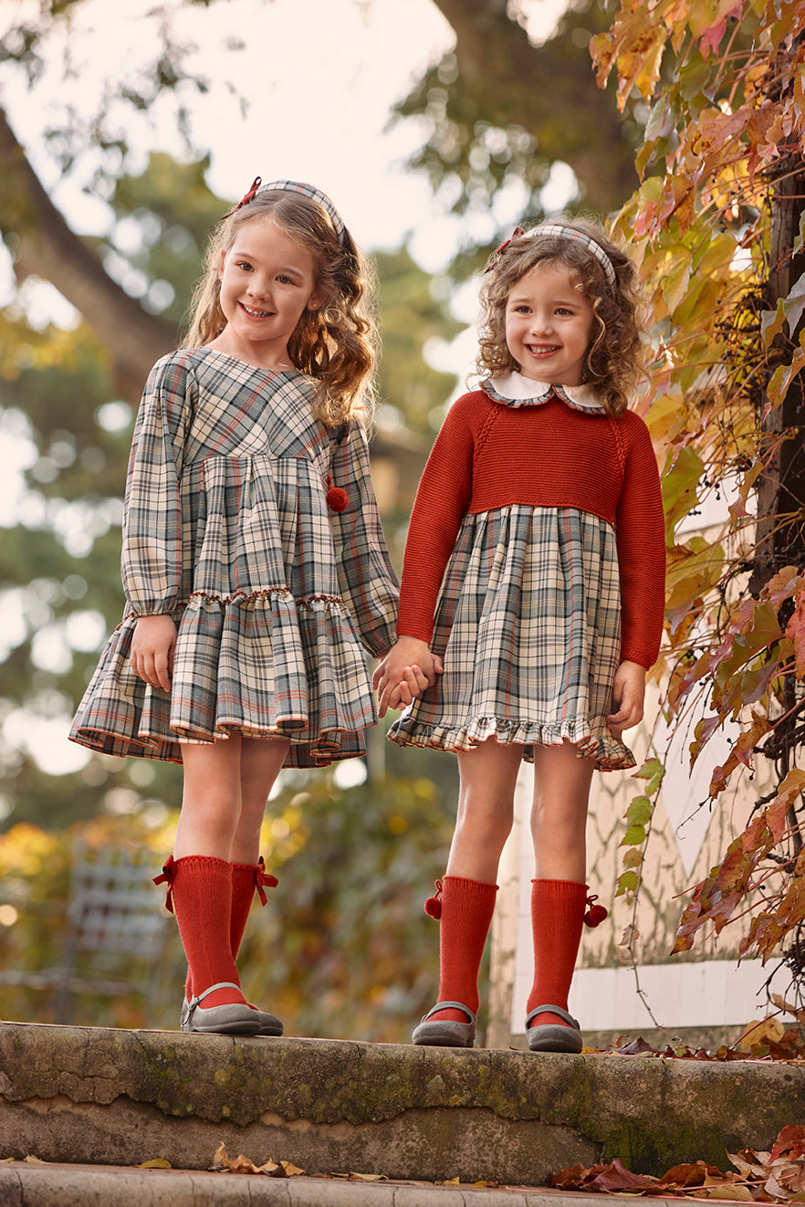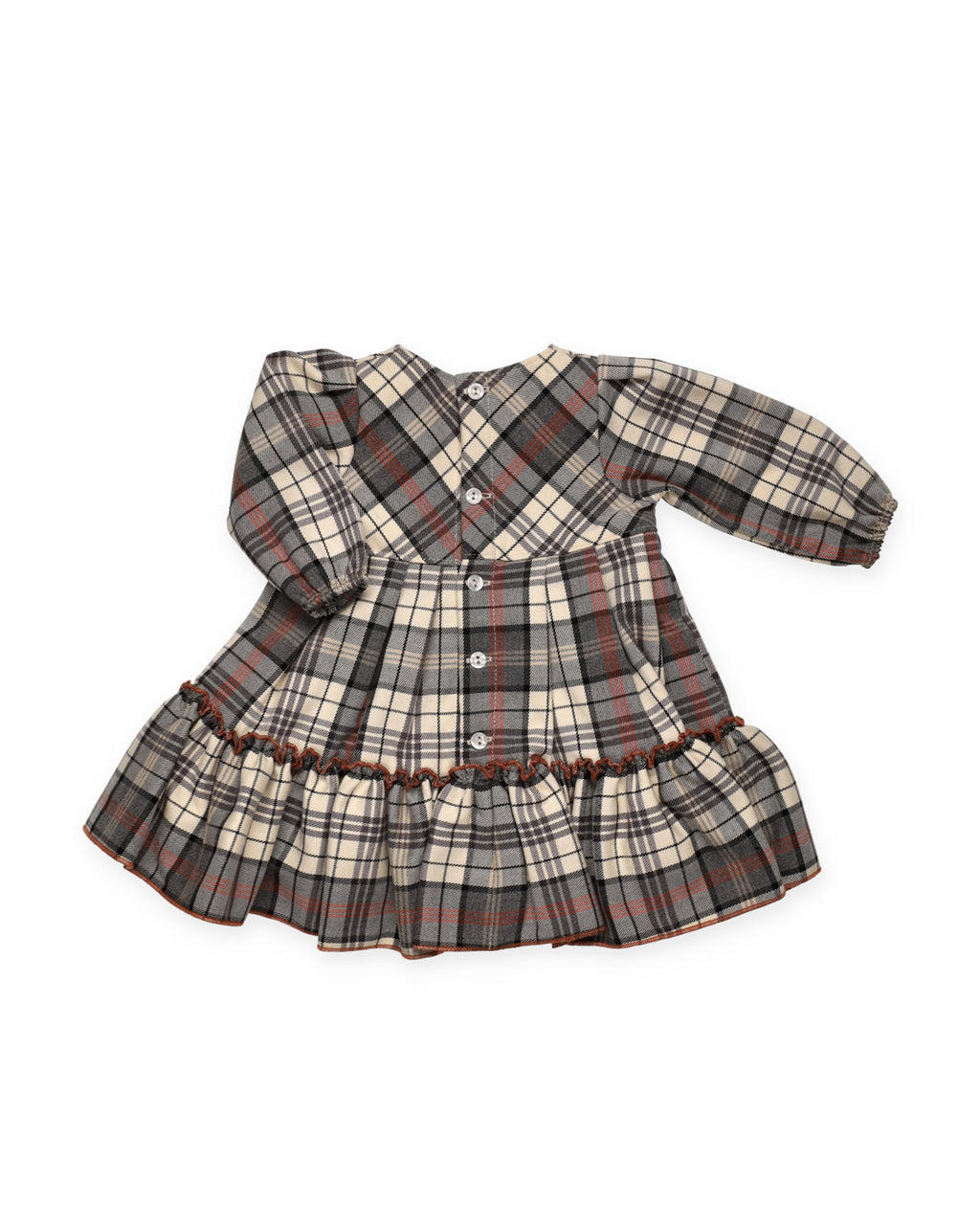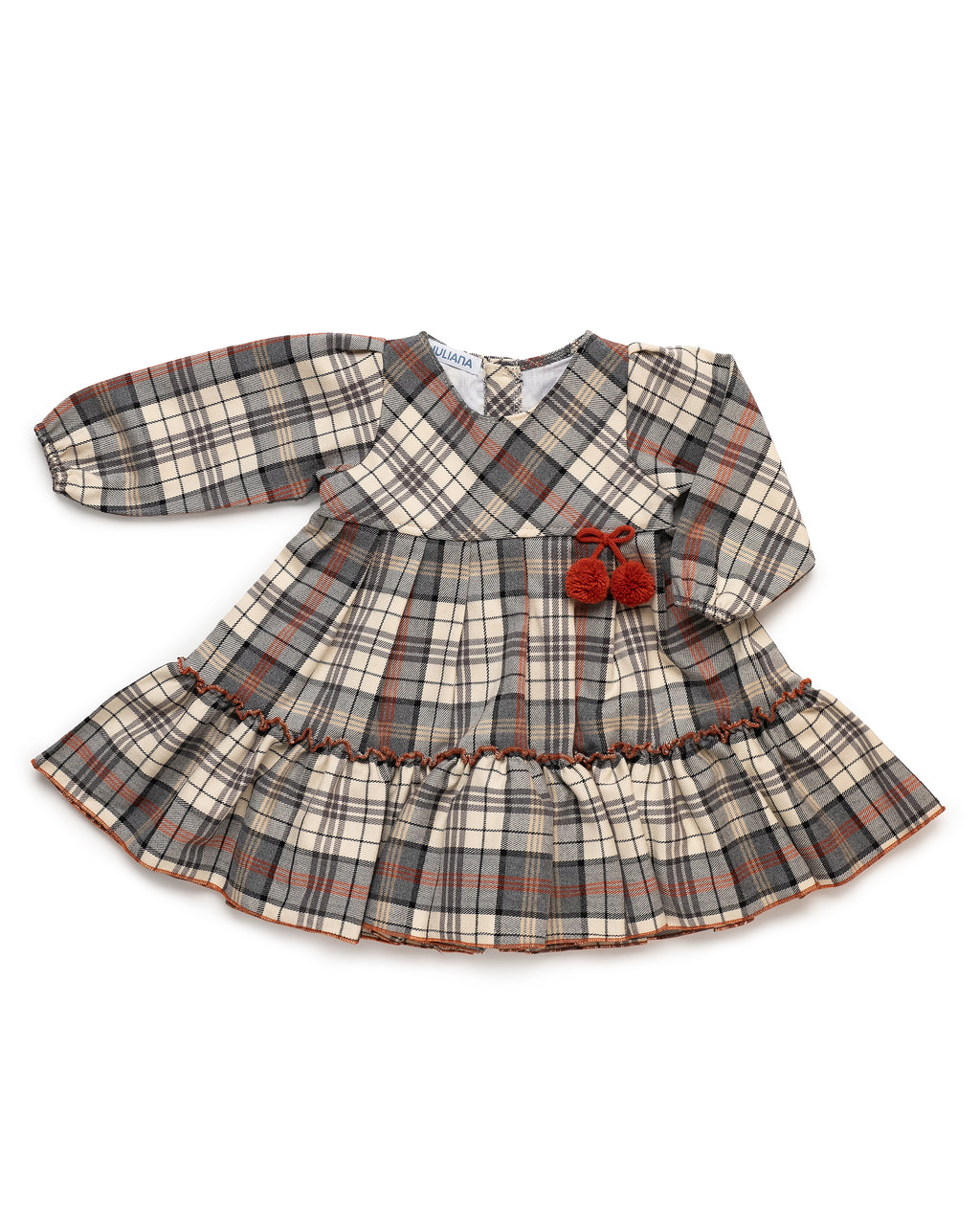 Checkered dress in ecru, gray, and tan tones. Featuring a structured bodice, adorned with two matching knitted pompoms and a ruffle at the hem.