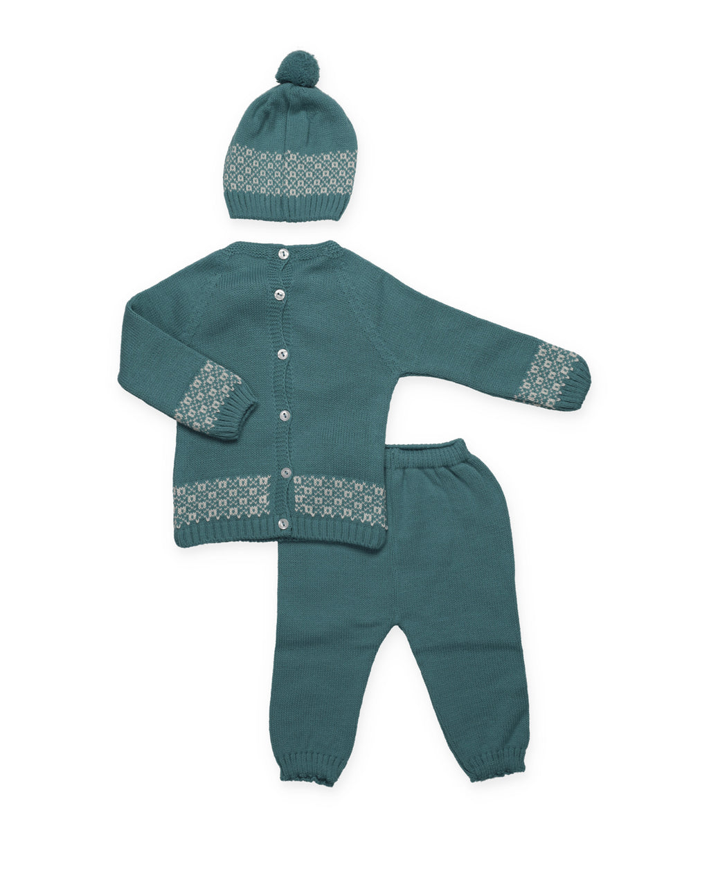 Sweater with a decorative border and two pompoms on the chest. Plain leggings and matching hat.