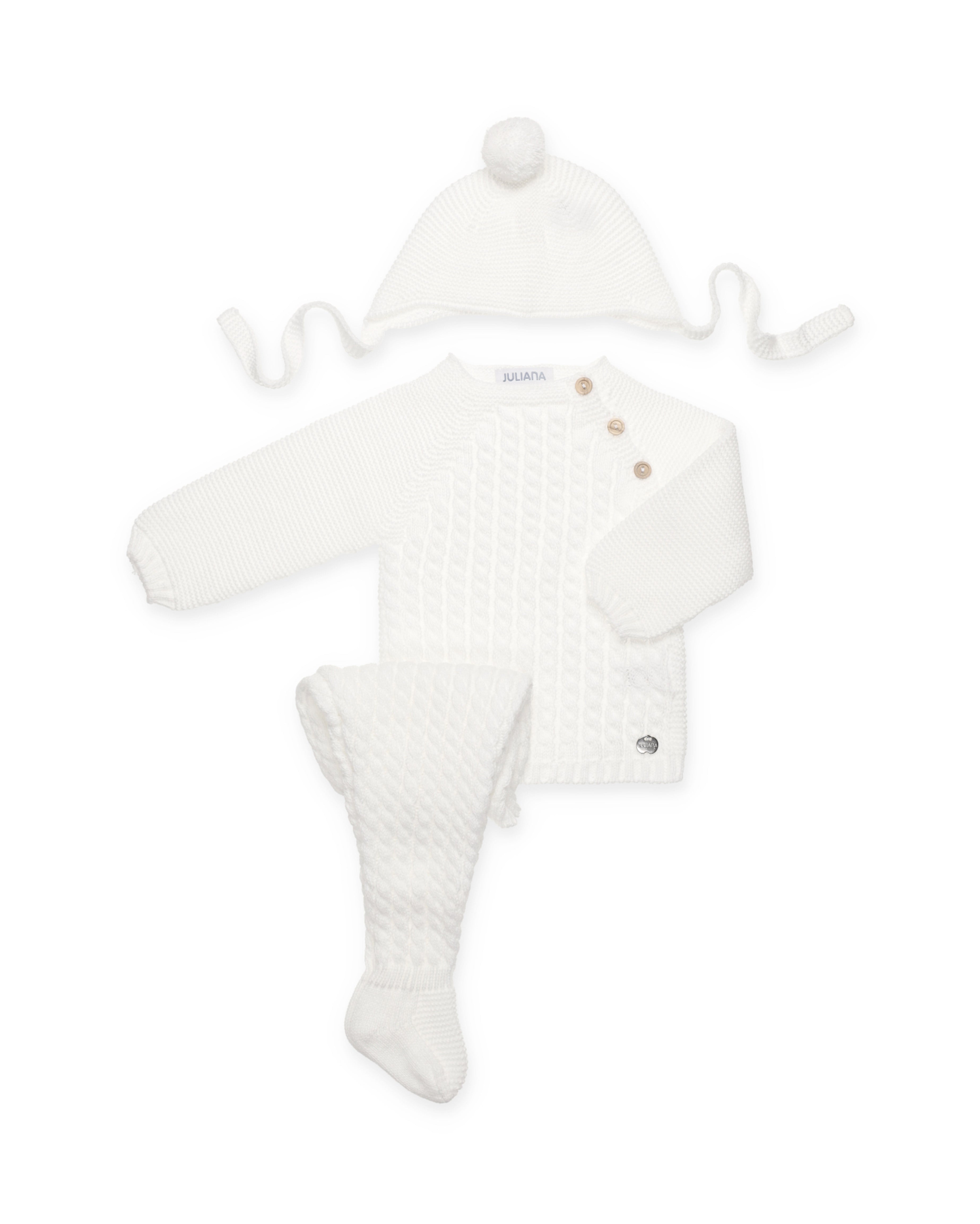Knitted sweater with cable ties on the body. Plain round neckline, ribbed cuffs and hem. Plain leggings and simple hat. A functional staple.