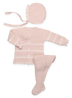 Sweater with gathered bodice and decorative ribbon loop. Matching leggings and hat.