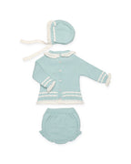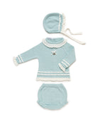 Knitted set with a pleated sweater and openwork at the yoke, a plain knit romper, and a matching hat.