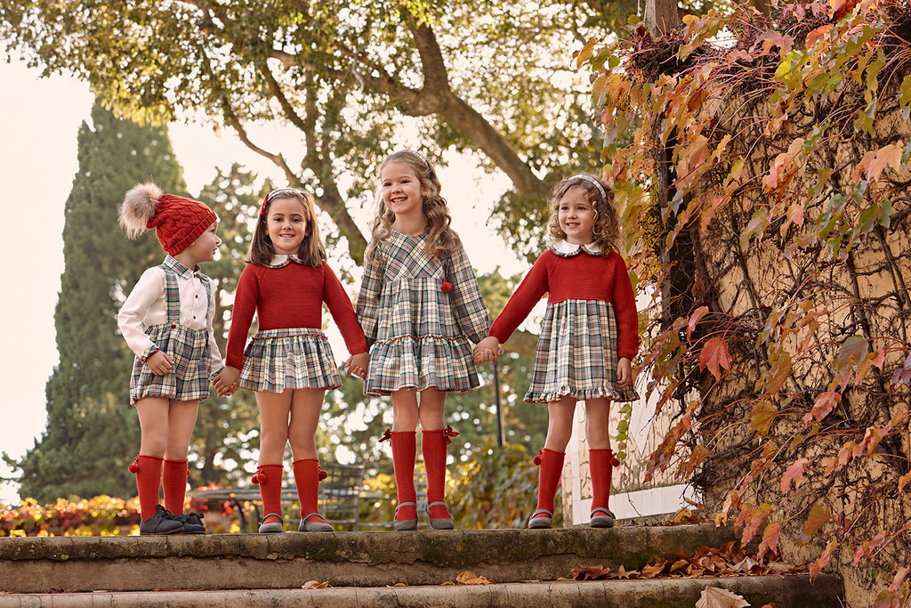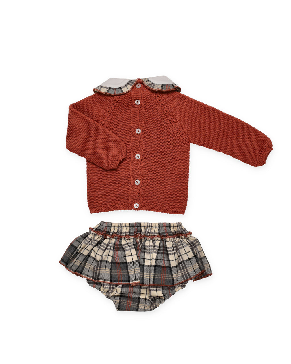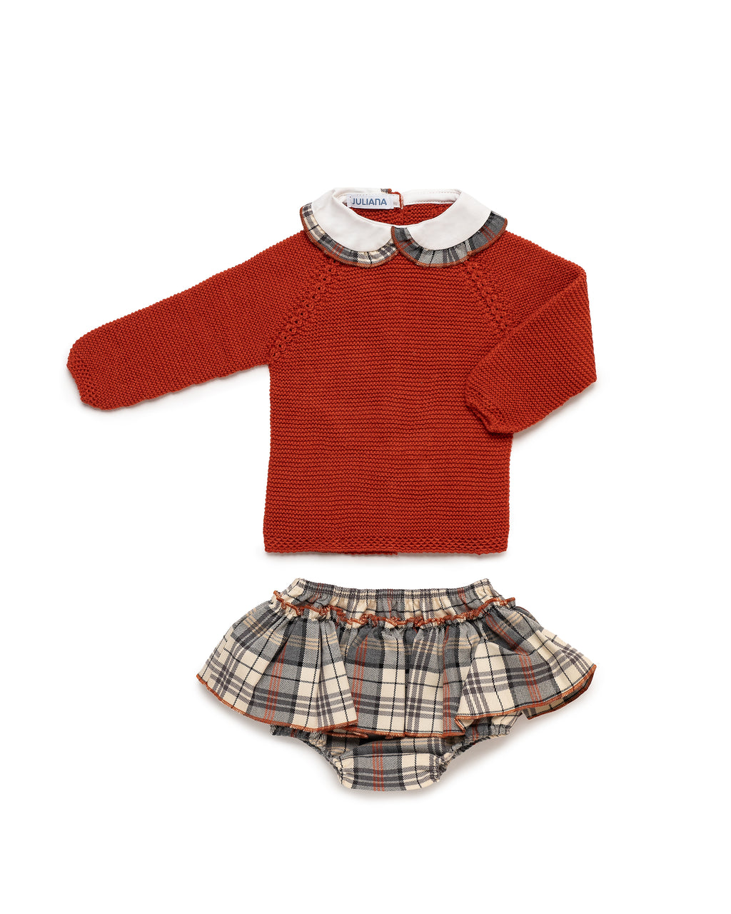 Two-piece set. Knit sweater in a teal color with a white fabric collar and matching plaid trim on the inside. Plaid romper with a ruffle, finished with teal terry.