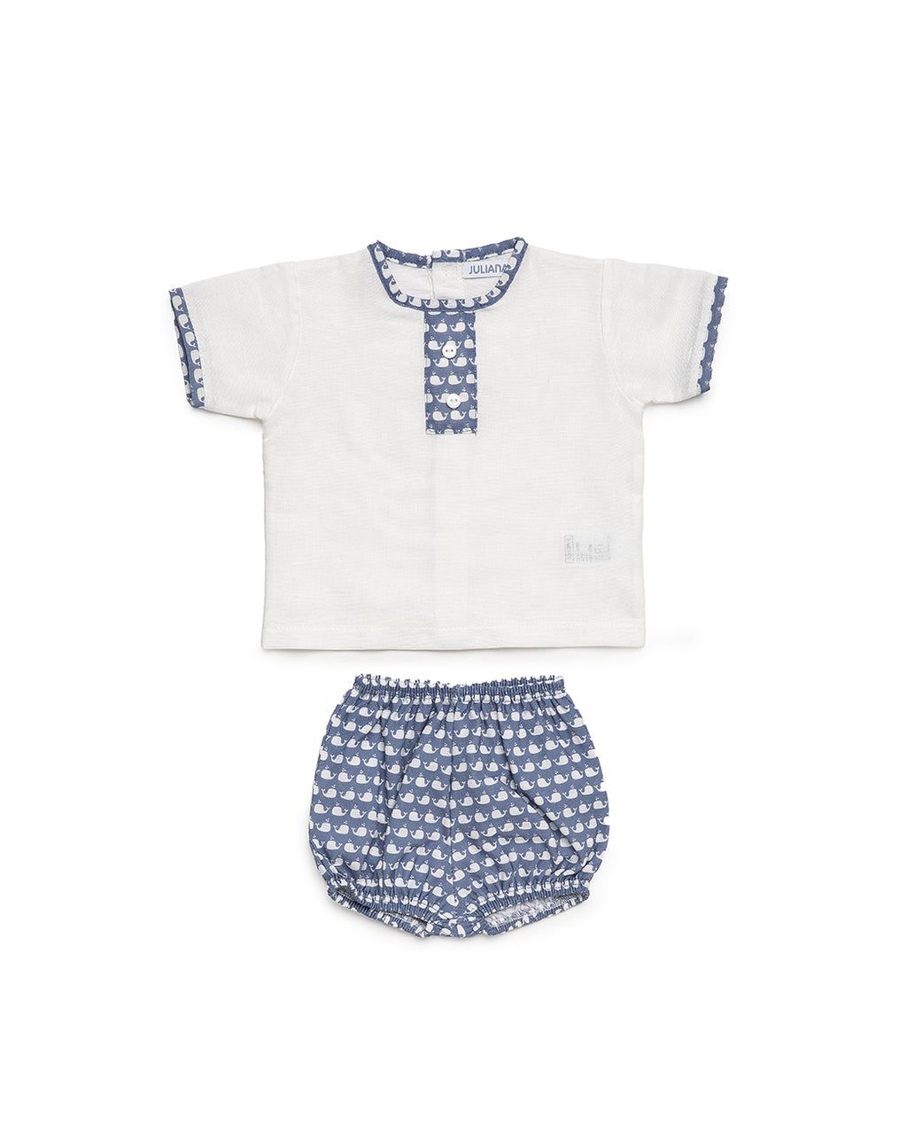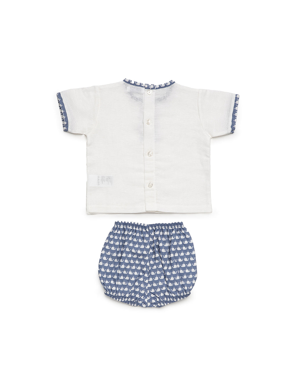 Conjunto de camisa lisa con detalles en tejido estampado de tela de ballenas y pantalón a juego. Un diseño ligero y cómodo para los días de verano.
