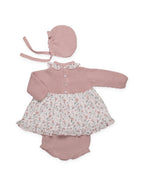 Dusty pink knitted dress with a soft floral print skirt. Matching ruffled collar and delicate bobble details on the bodice. Includes matching romper and knitted hat.