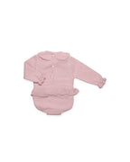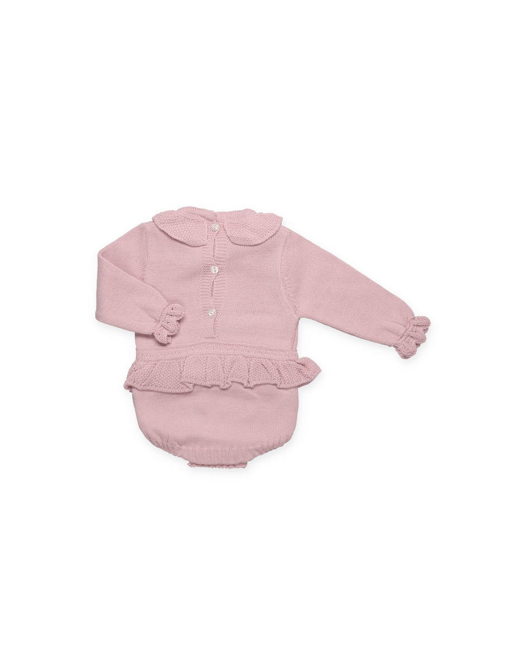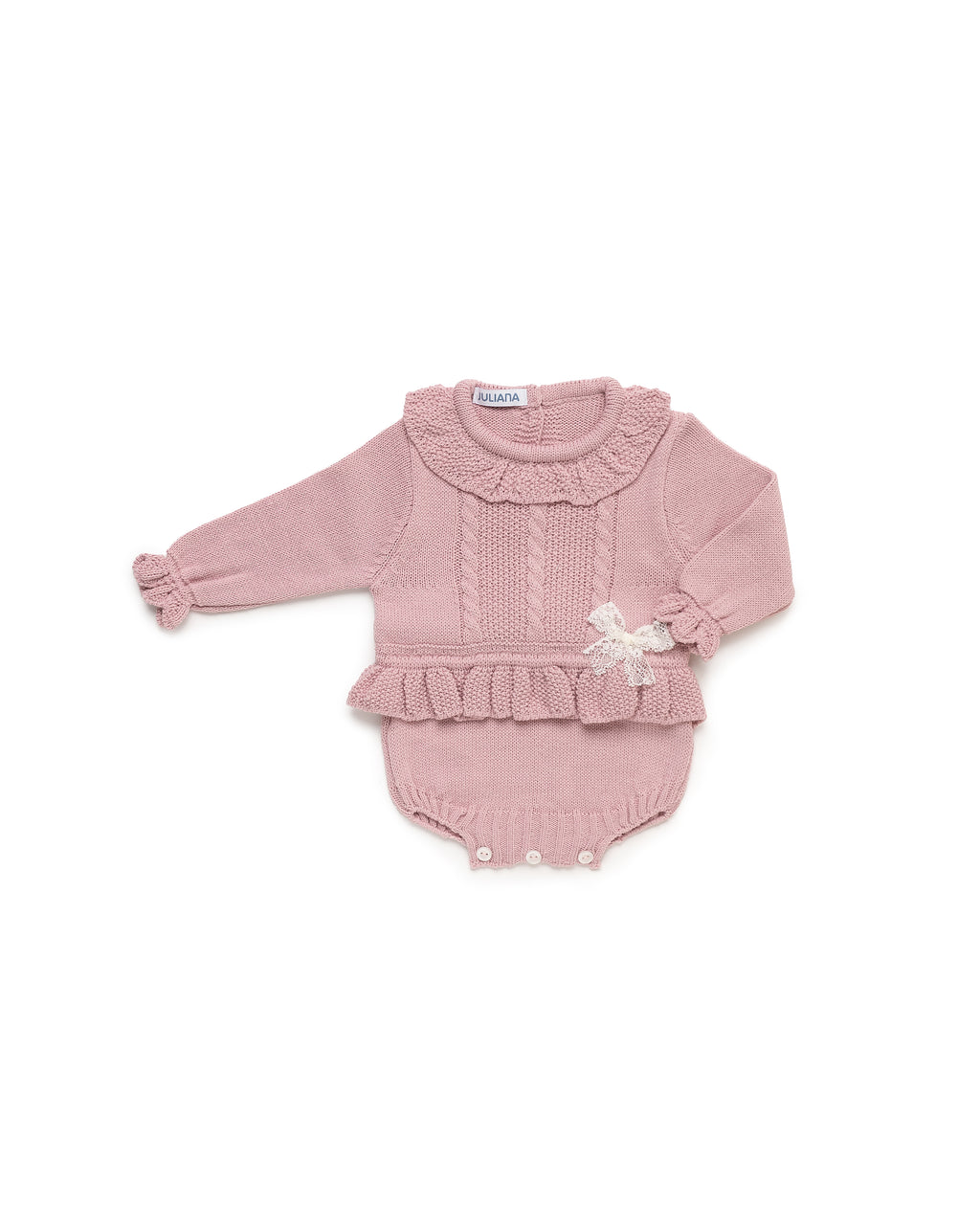Knitted romper with openwork details on the front and a delicate ruffle at the hem. A round neckline matches the ruffle, and lace bows at the waist add a romantic touch. Button closure at the back and crotch.