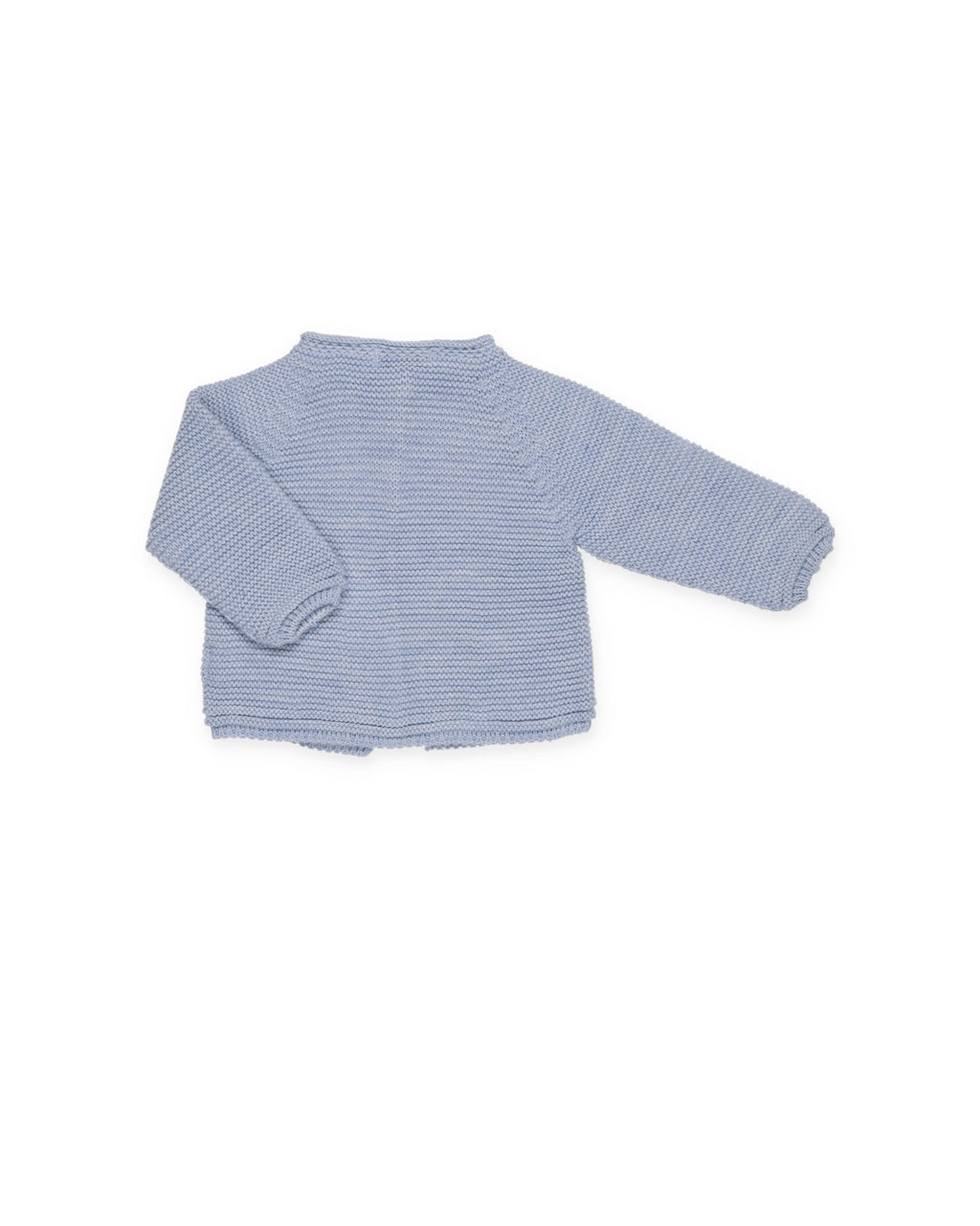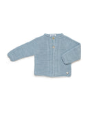 Knitted cardigan with delicate braids on the front and a two-button closure. A soft and enveloping garment, designed to gently wrap baby's arms during his first walks.