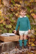 Baltic green knit sweater with openwork detailing on the raglan sleeves and a tree-print shirt collar. Matching printed fabric pants.