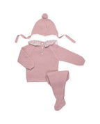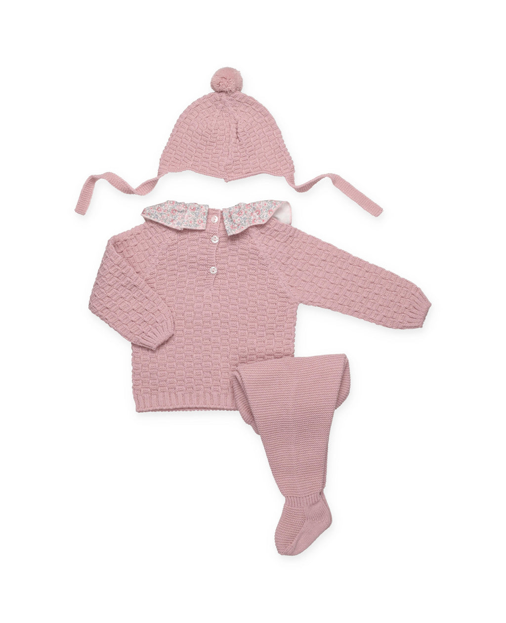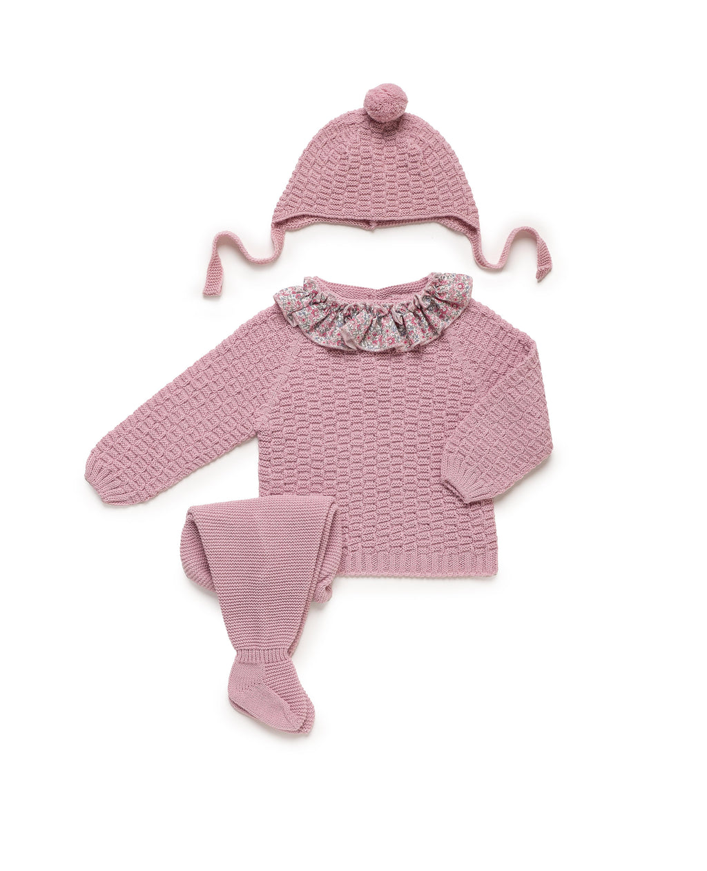 Maglione a quadri con una piccola balza floreale sul collo. Leggings e cappello coordinati.