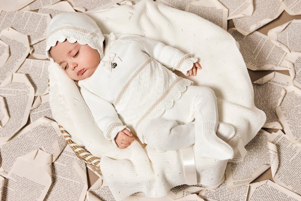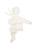 Maglione a righe in maglia con trecce decorative. Scollo rotondo impreziosito da un bordo in pizzo lavorato a maglia e un piccolo fiocco centrale con ciondolo metallico. Polsini arricciati con volant e bordo decorativo a contrasto, così come l'orlo. Chiusura con bottoni sul retro. Leggings coordinati e berretto in maglia semplice inclusi.