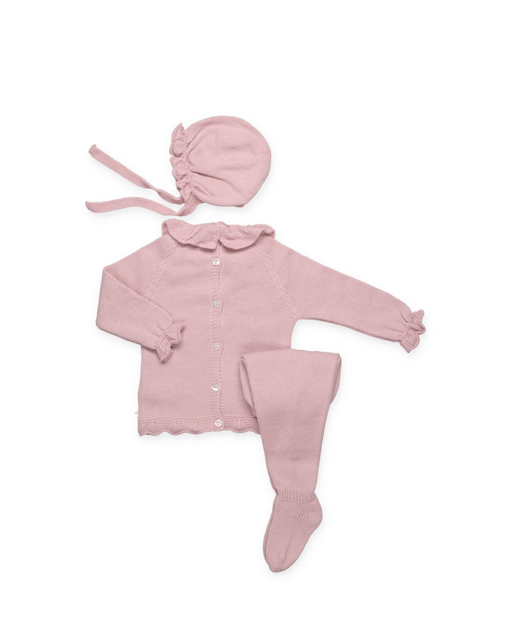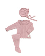Maglione lavorato a maglia con motivo a trecce verticali sul davanti. Scollo a V e polsini a coste. Leggings semplici e berretto lavorato a maglia basic inclusi.