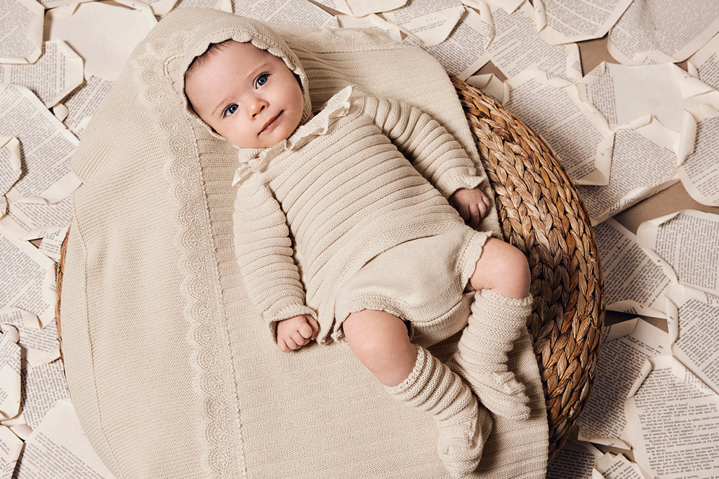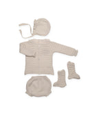 Completo composto da quattro pezzi: maglione in lino con bordo in pizzo sul collo, tutina, stivaletti e cappello abbinato.