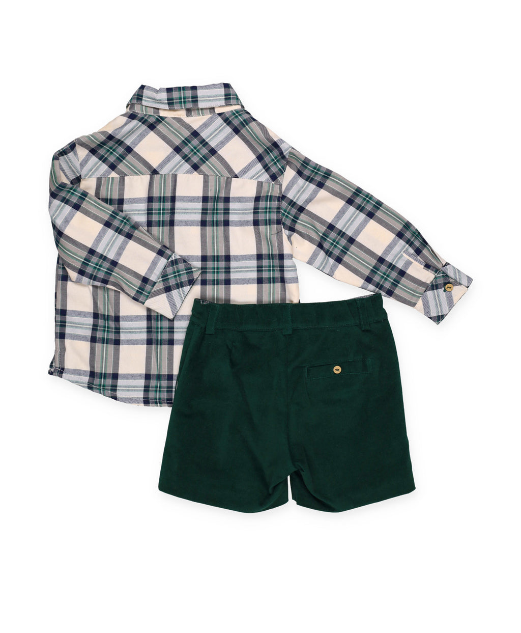 Completo elegante e intramontabile per bambini, composto da una camicia a maniche lunghe in tessuto a quadri verde ed écru con colletto classico e bottoni in legno. Abbinato a pantaloncini in velluto a coste verde muschio con tasche laterali.