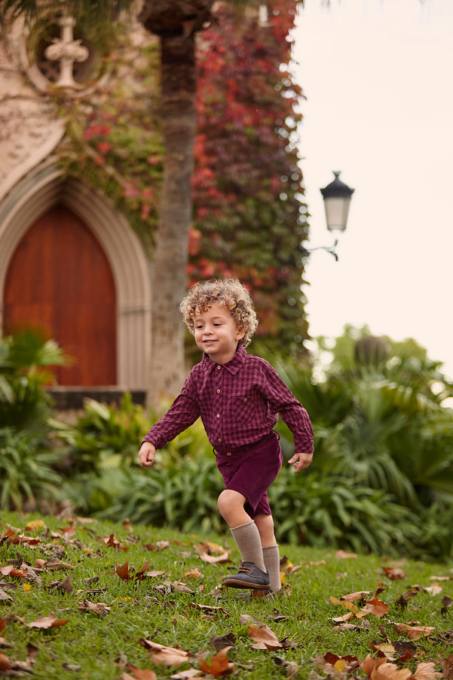 Completo autunnale per bambino composto da una camicia a maniche lunghe a quadri bordeaux e rosa antico, con bottoni frontali e taschino sul petto. Completano il completo pantaloncini coordinati in velluto a coste bordeaux con tasche laterali.