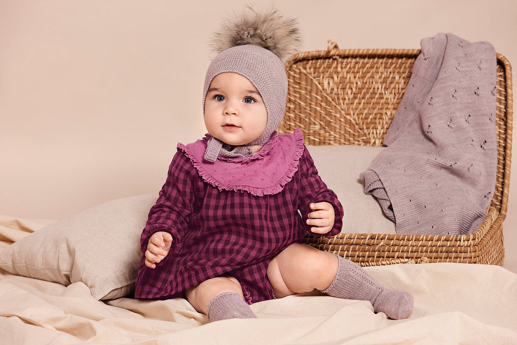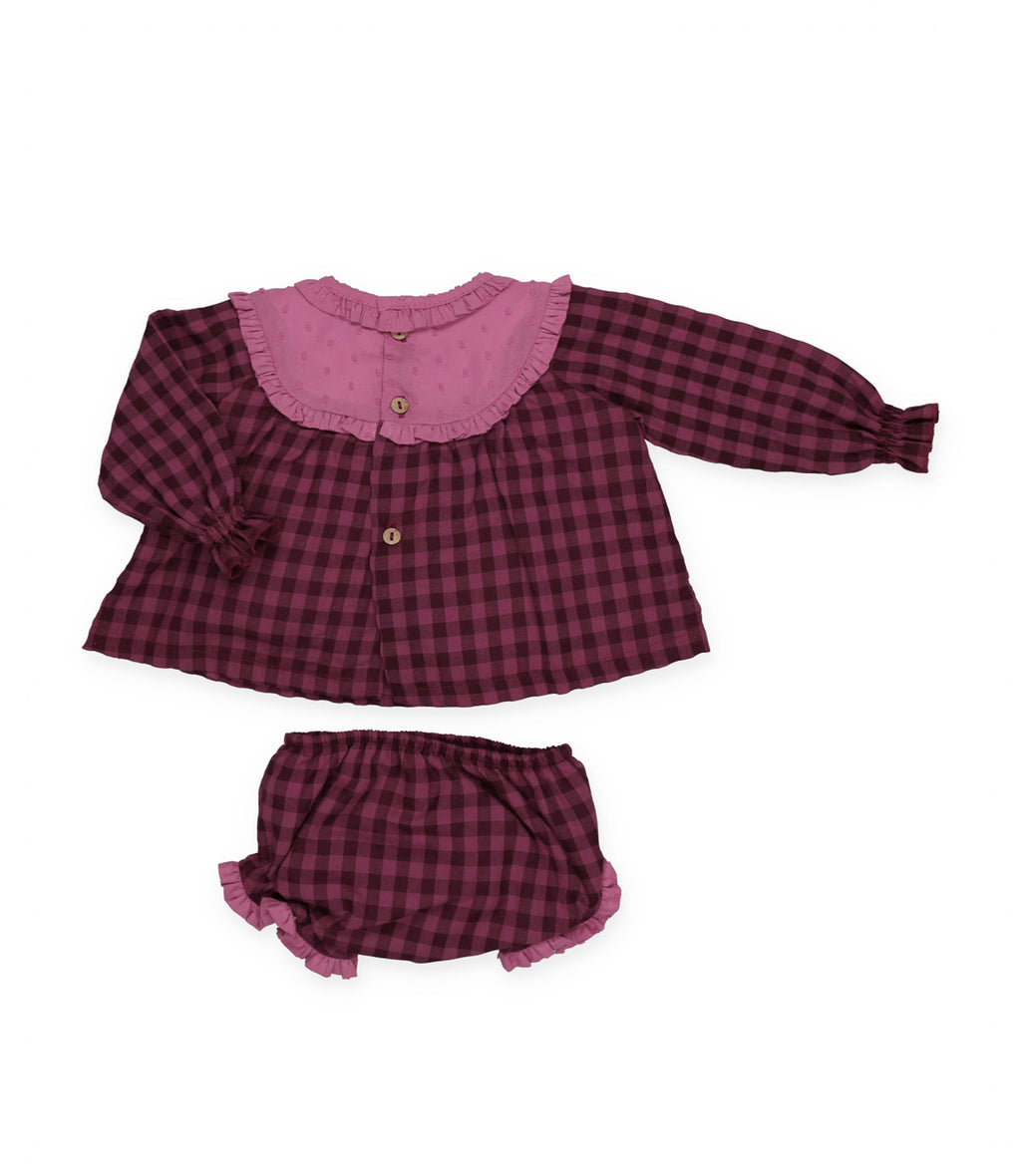 Vestitino in tessuto a quadri bordeaux con pettorina in plumetis rosa antico. Presenta un colletto arricciato abbinato e piccoli dettagli come il fiocco in velluto bordeaux sull'orlo. Include una tutina in tessuto con volant a contrasto.