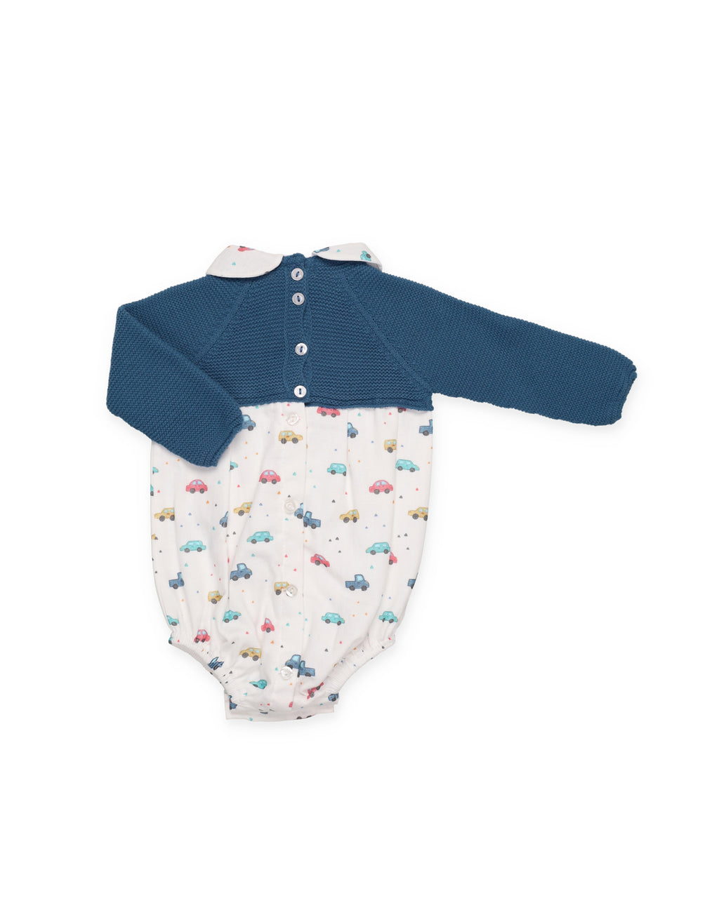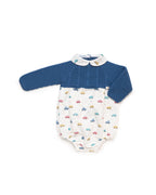 Tutina con maglia tricot blu nella parte superiore e parte inferiore bianca con stampa multicolore di un passeggino. Girocollo coordinato. Un outfit vivace e colorato per le prime scoperte.