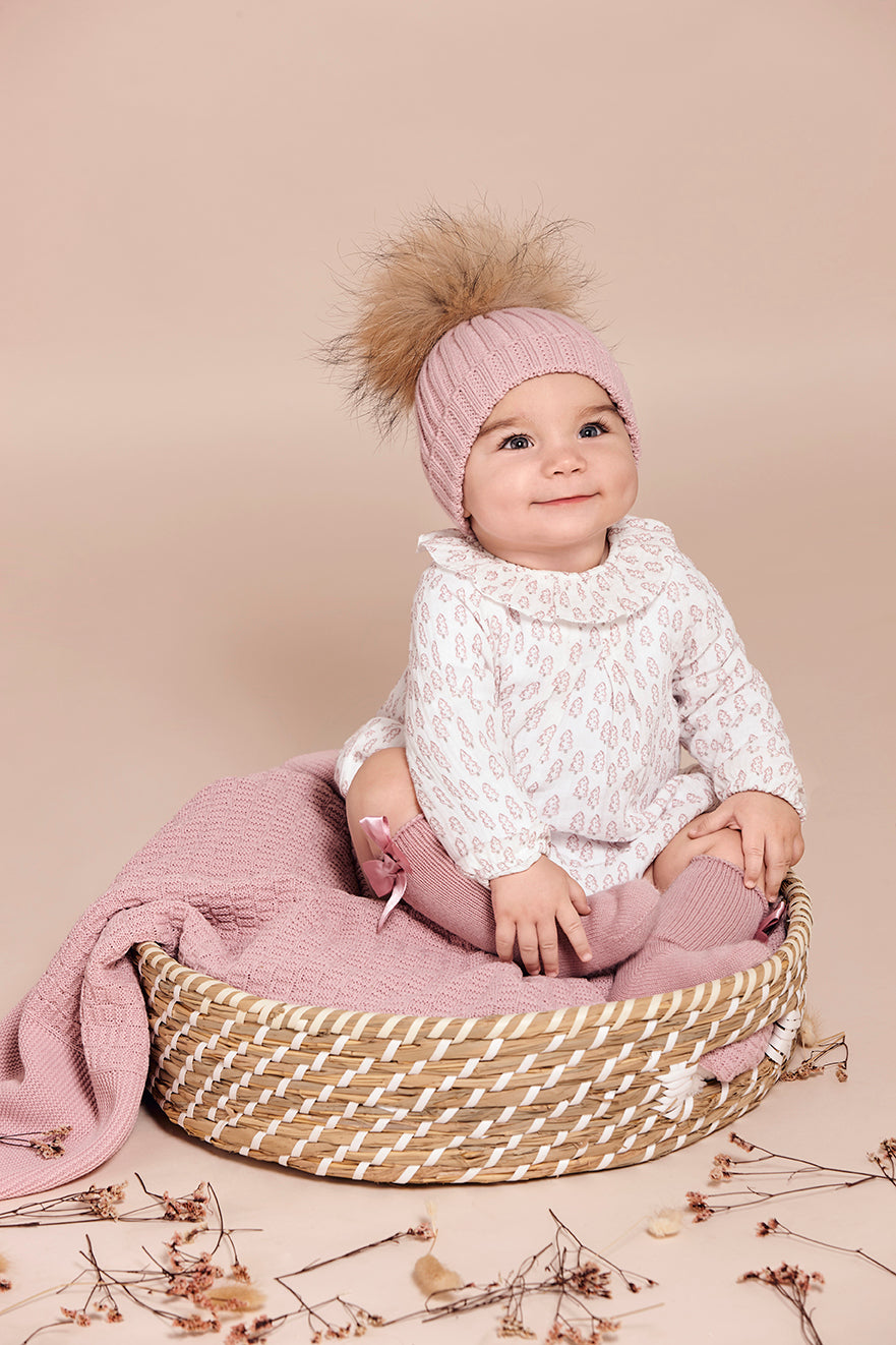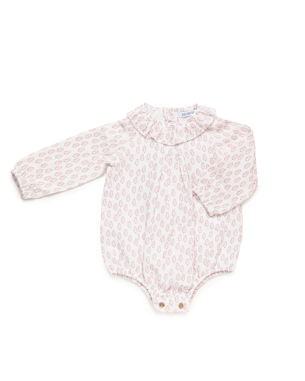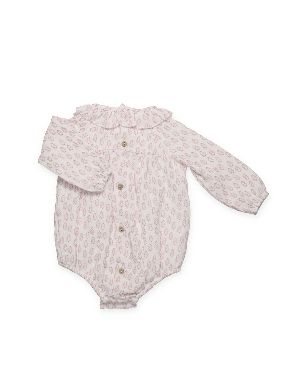 Tutina in cotone a maniche lunghe con delicata stampa rosa cipria. La scollatura arricciata e arricciata aggiunge un tocco romantico. Pratica chiusura con bottoni sul fondo e sul retro.