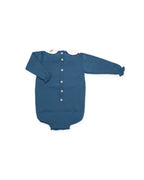 Tutina da hostess in maglia con dettaglio di un'auto color senape al centro. Scollo rotondo in tessuto bianco con stampa di passeggini coordinata. Pratica chiusura con bottoni sul retro e sul cavallo.