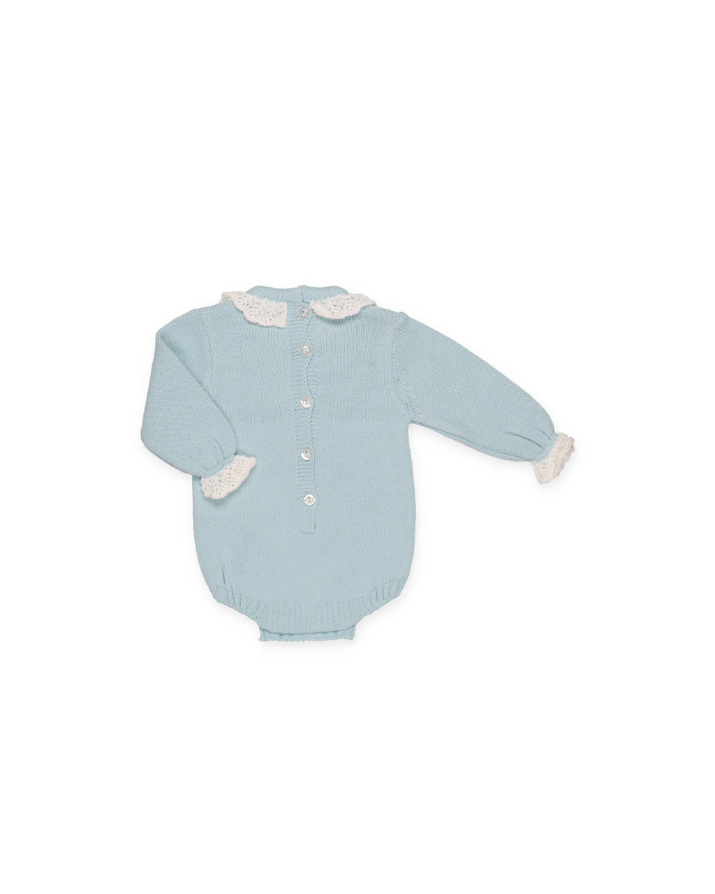 Tutina a maniche lunghe in maglia tricot. Il delicato colletto traforato e i polsini sono di grande effetto. Il fiocco con pompon al centro aggiunge un tocco di charme. Presenta una comoda chiusura con bottoni sul fondo e sul retro.