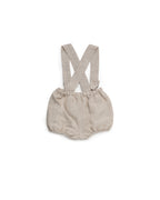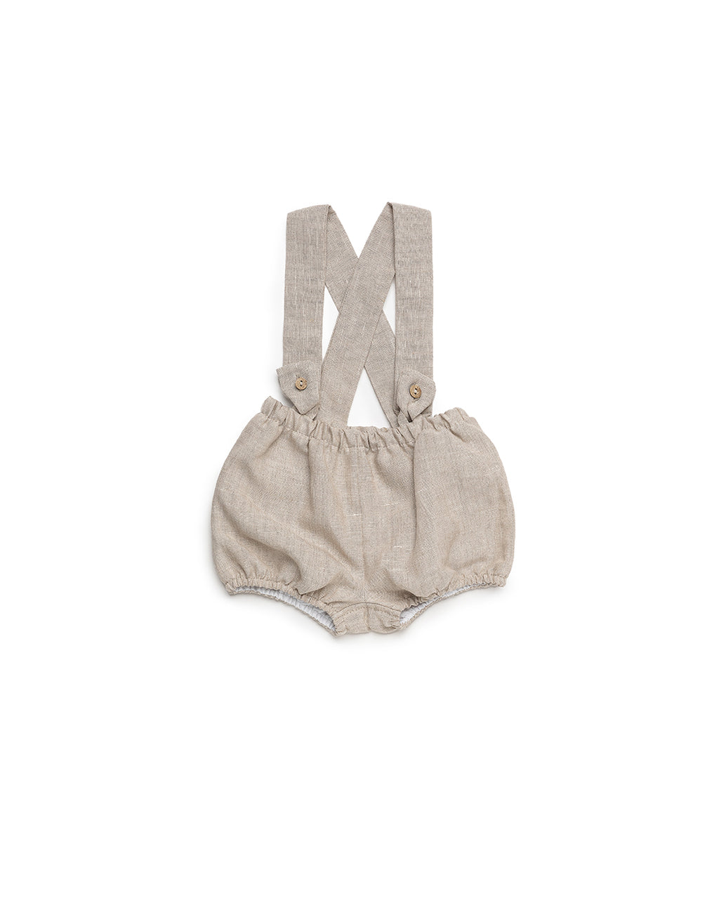 Peto de lino para bebé con tirantes cruzados y botones de madera. Un diseño ligero y cómodo, ideal para los días de primavera y verano.