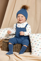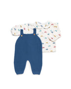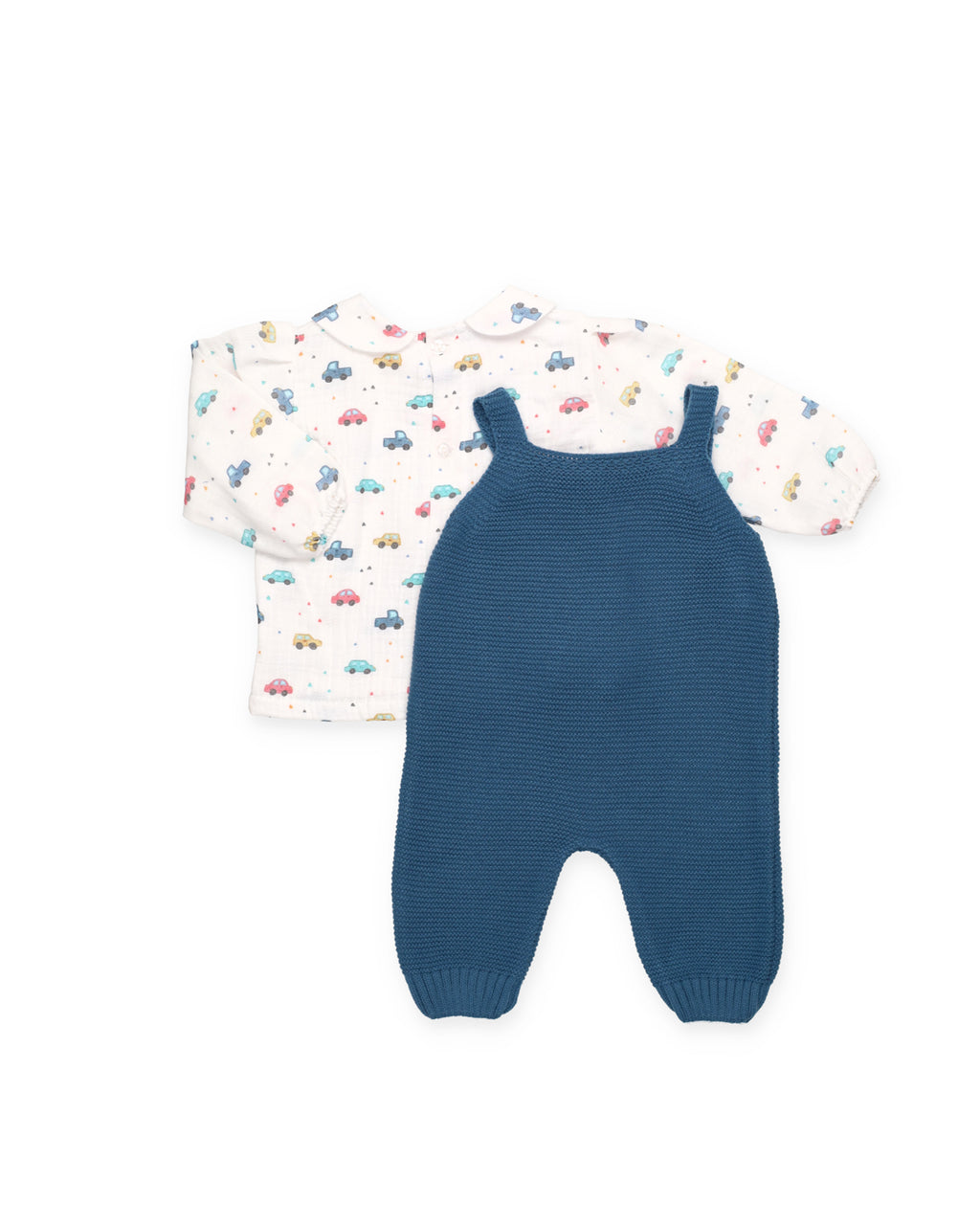Una lunga tuta in tricot blu da hostess e una camicia bianca a maniche lunghe in cotone con una stampa di auto allegra in vari colori. La scollatura arrotondata e i piccoli polsini elastici completano un look comodo e divertente per i primi mesi.