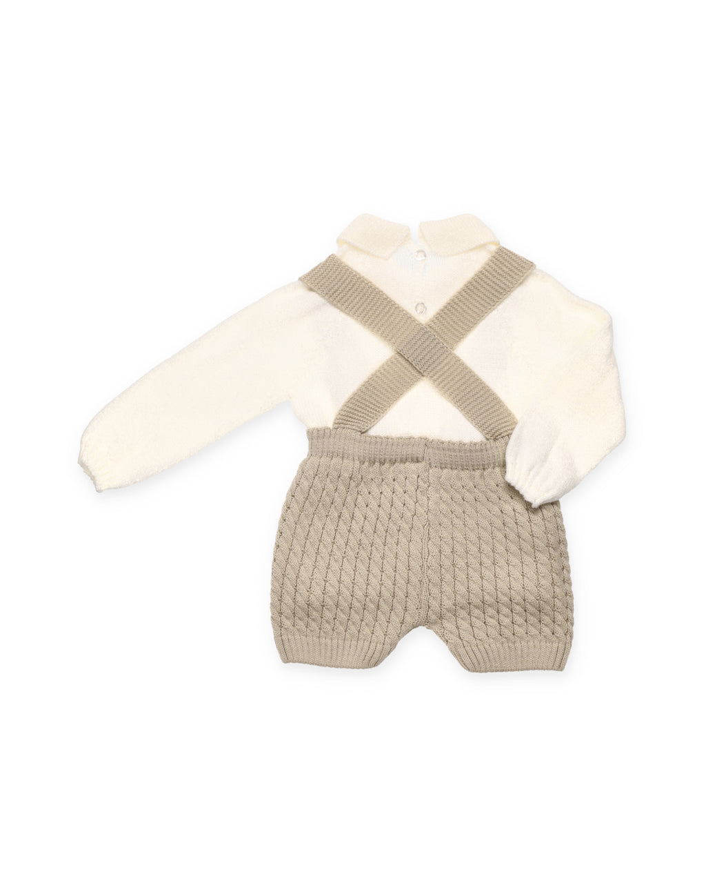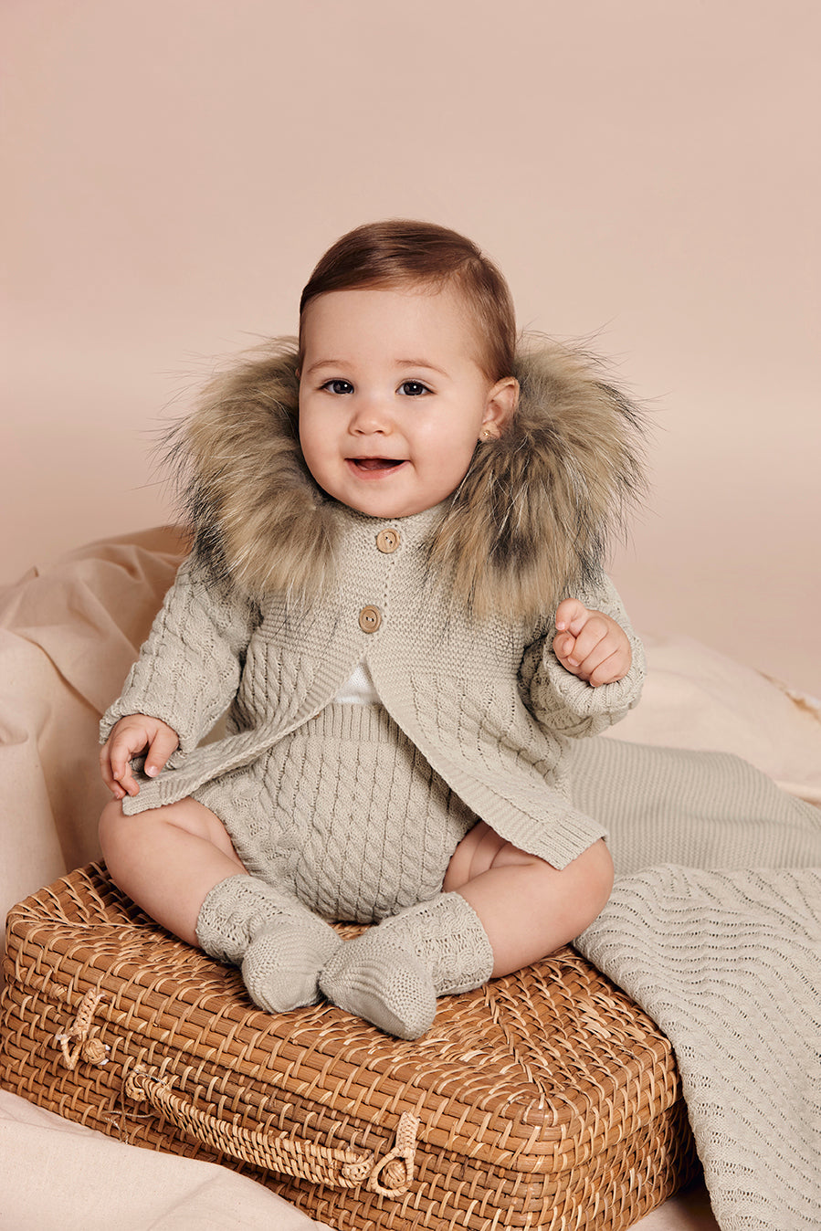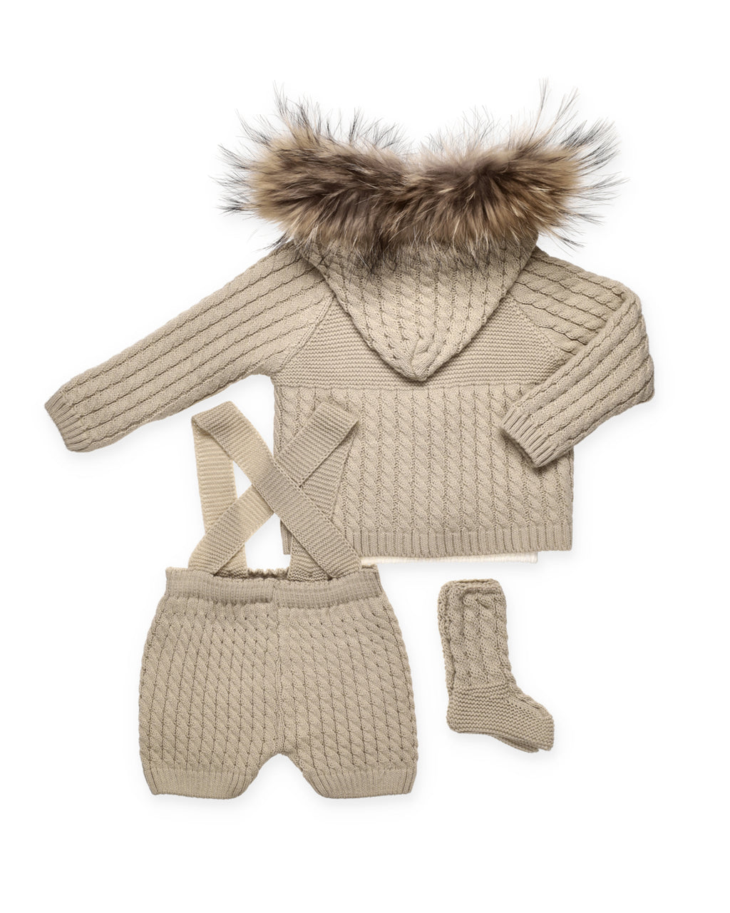 Completo lavorato a maglia composto da maglione con scollo a V, giacca con cappuccio staccabile in pelliccia sintetica, chiusura con bottoni e motivo intrecciato, e salopette corta abbinata con spalline incrociate e bottoni. Include stivaletti lavorati a maglia coordinati.