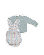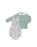 Salopette a righe multicolor in tonalità tenui: azzurro, rosa cipria, senape ed écru, con bottoni decorativi coordinati. Completa il tutto un maglione in maglia tricot con colletto e polsini a coste bianche con dettagli a onda.