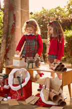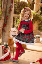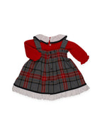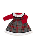 Un abito scamiciato con gonna ampia in tartan grigio, rosso ed écru. Il corpetto è in maglia rossa, con colletto in tessuto bianco bordato di grigio e pompon decorativi nella stessa tonalità.