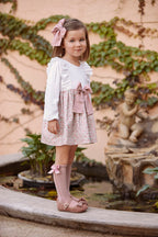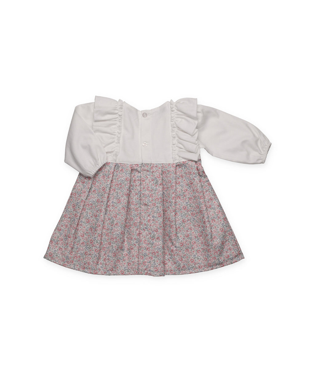 Abito a maniche lunghe con corpetto in tessuto bianco e dettaglio di volant sul davanti. La gonna presenta una delicata stampa floreale nei toni del rosa, rifinita con un grande fiocco centrale per un look romantico e senza tempo.
