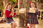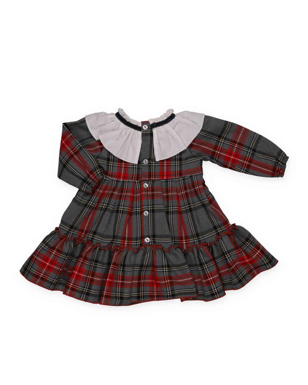 Abito in tartan grigio, rosso e senape. Presenta un ampio colletto in tessuto bianco con fiocco in velluto grigio e una gonna arricciata sull'orlo per un tocco di stile in più.