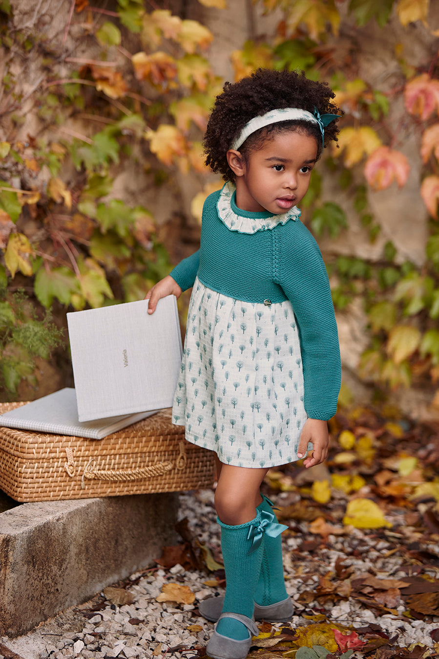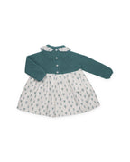 Abito con corpetto in maglia tricot verde baltico e gonna in tessuto bianco con stampa di piccoli alberi in tinta. Il colletto arricciato in tessuto coordinato aggiunge un tocco di delicatezza.