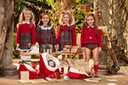 Abito con corpetto in maglia tricot rossa e gonna scozzese grigia, rossa ed écru. Colletto baby-doll con rifiniture in pizzo bianco e fiocco con pompon in vita. L'orlo è rifinito con un delicato volant bianco.