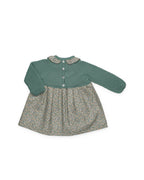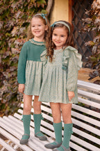 Abito in maglia verde foglia con arricciatura e gonna con stampa floreale. Presenta un colletto arricciato abbinato e un fiocco con pompon in vita.