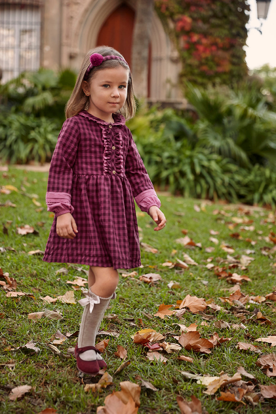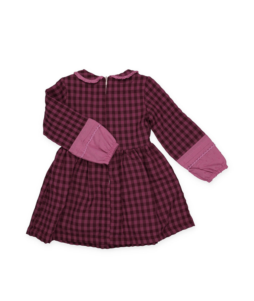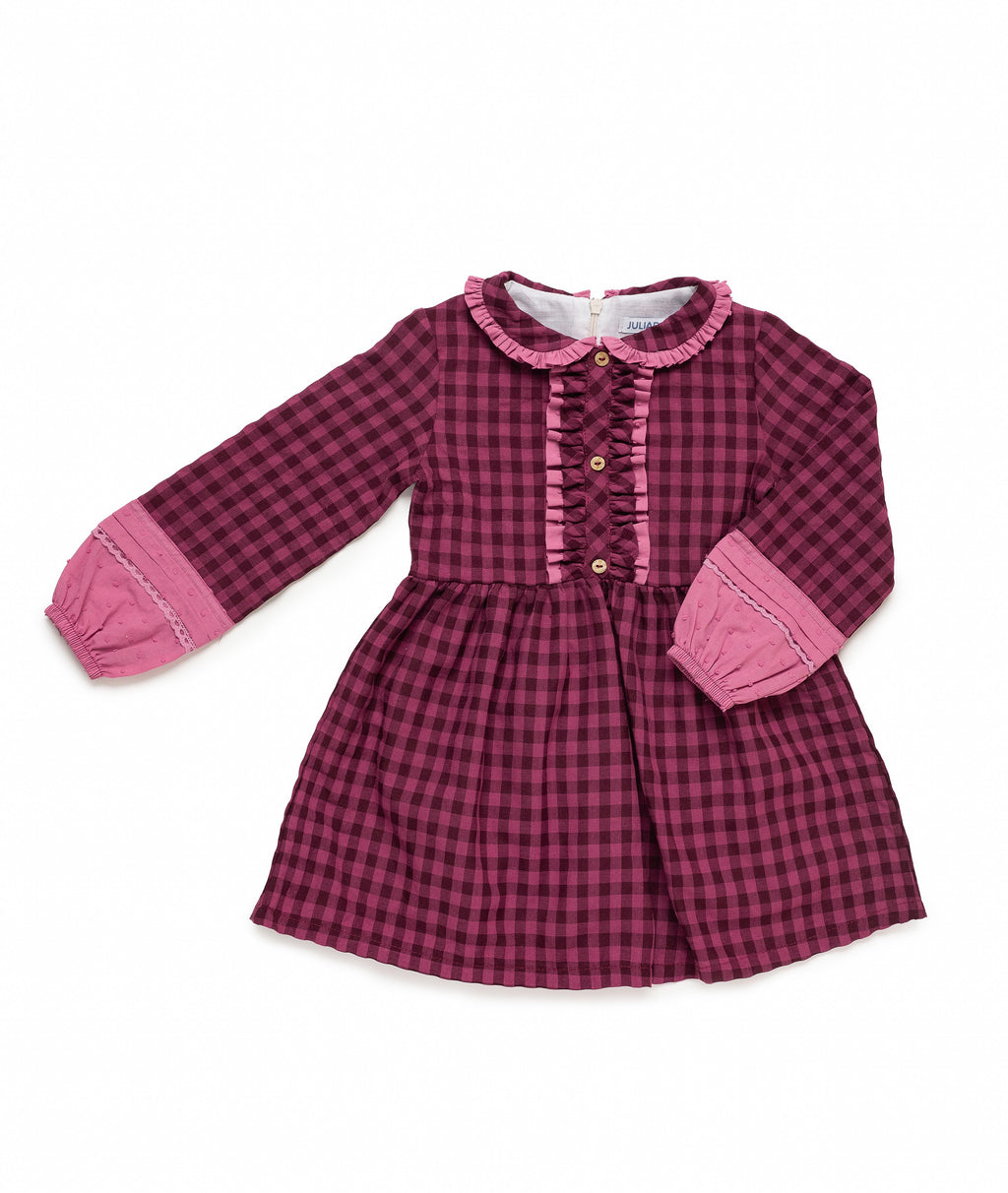 Abito a quadretti bordeaux con dettagli rosa cipria a contrasto. Scollo rotondo con volant arricciato, abbottonatura centrale e dettagli arricciati. Maniche lunghe rifinite in tessuto plumetis e pizzo abbinato.