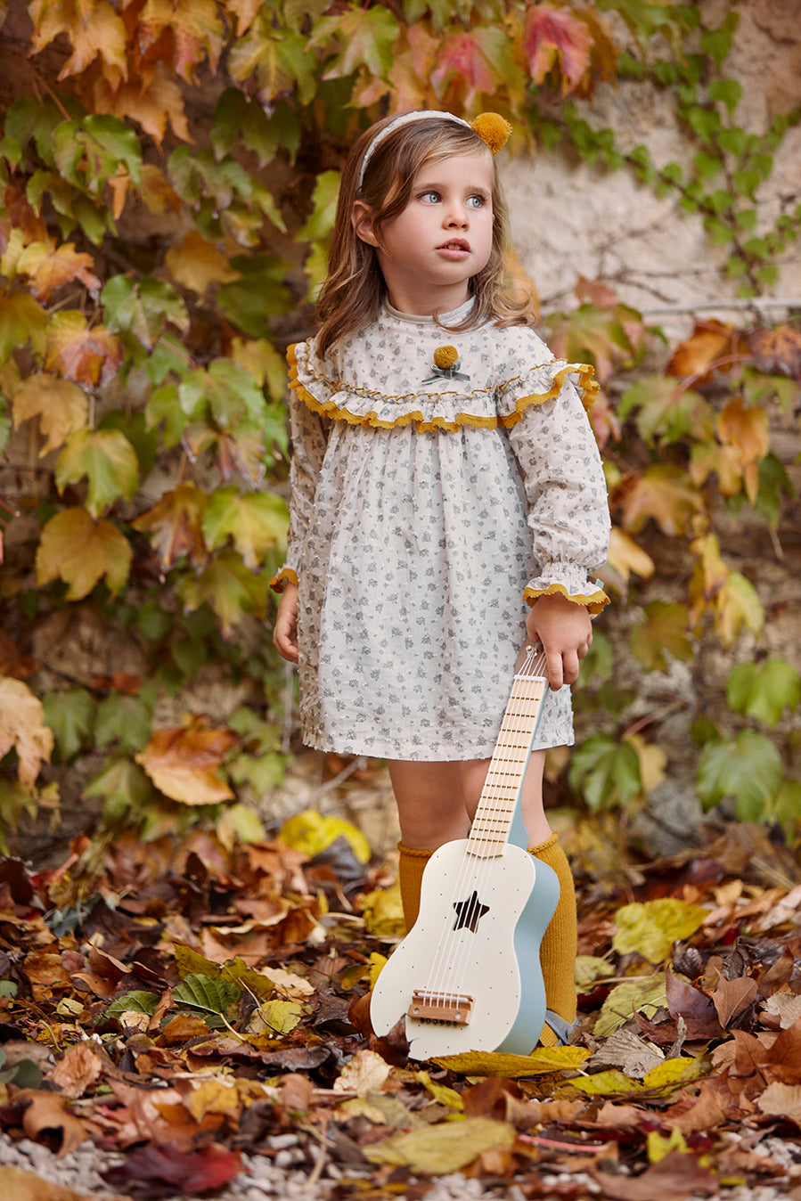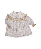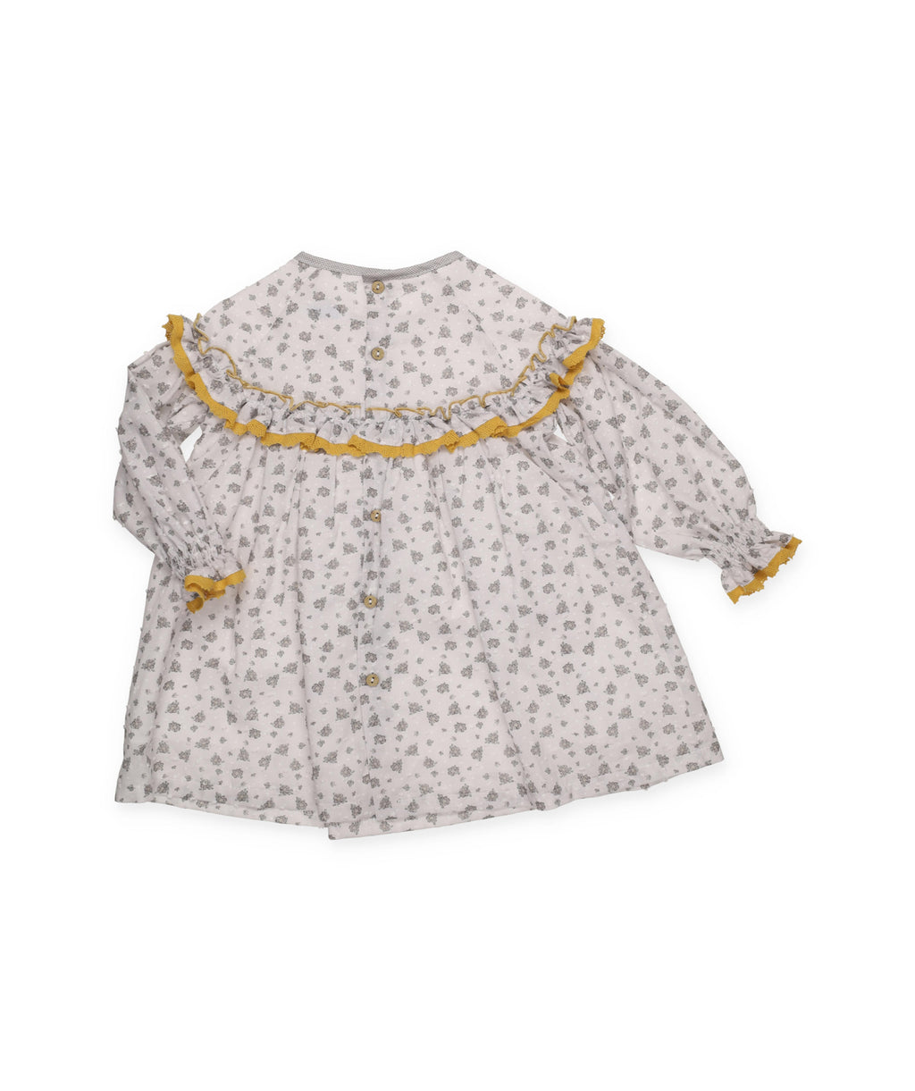 Abito a maniche lunghe in tessuto bianco con stampa floreale grigia. Presenta un ampio volant decorativo sul petto con bordo in pizzo senape, abbinato ai dettagli dei polsini. Decorato con un pompon decorativo su un piccolo fiocco di velluto grigio.