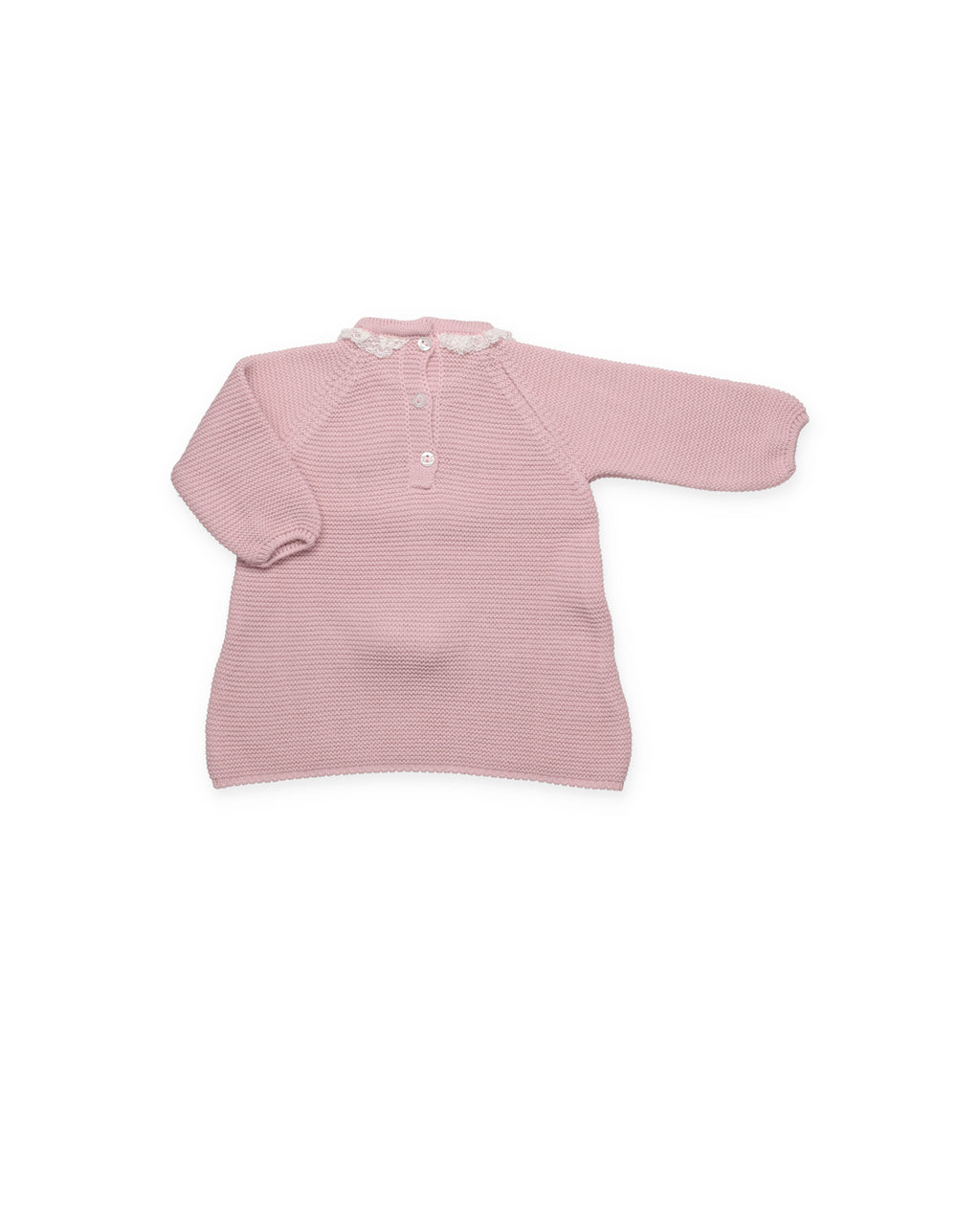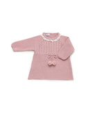Abito in maglia a maniche lunghe con corpetto intrecciato, scollo rotondo rifinito con pizzo grezzo e fiocco con pompon in vita.