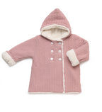 Abrigo de punto tricot con dibujo de cuadritos. Forro interior en suave borreguito crudo, ideal para mantener el calor en los días fríos. Diseño con capucha y doble botonadura frontal. Puños vueltos que dejan ver el interior.