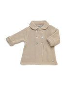 Abrigo de punto tricot con diseño de doble botonadura y cuello redondeado tipo bebé. Corte clásico con puños vueltos y textura fina y uniforme. Perfecto para combinar con cualquier conjunto de invierno.