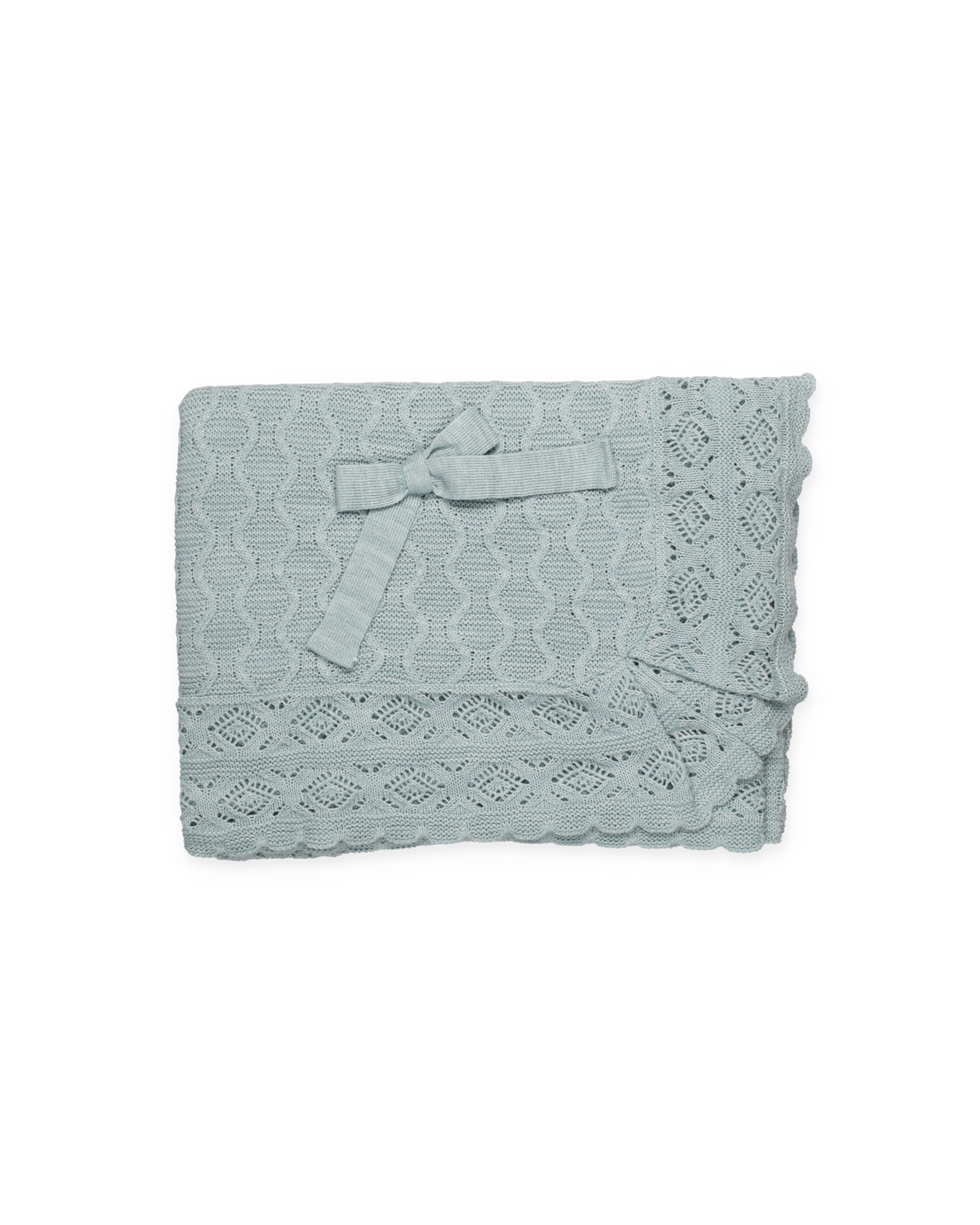 Chal de punto con estructura de aranes y volante decorativo con dibujo de rombos. Diseño amplio y envolvente, fácil de colocar sobre el bebé o en el carrito.