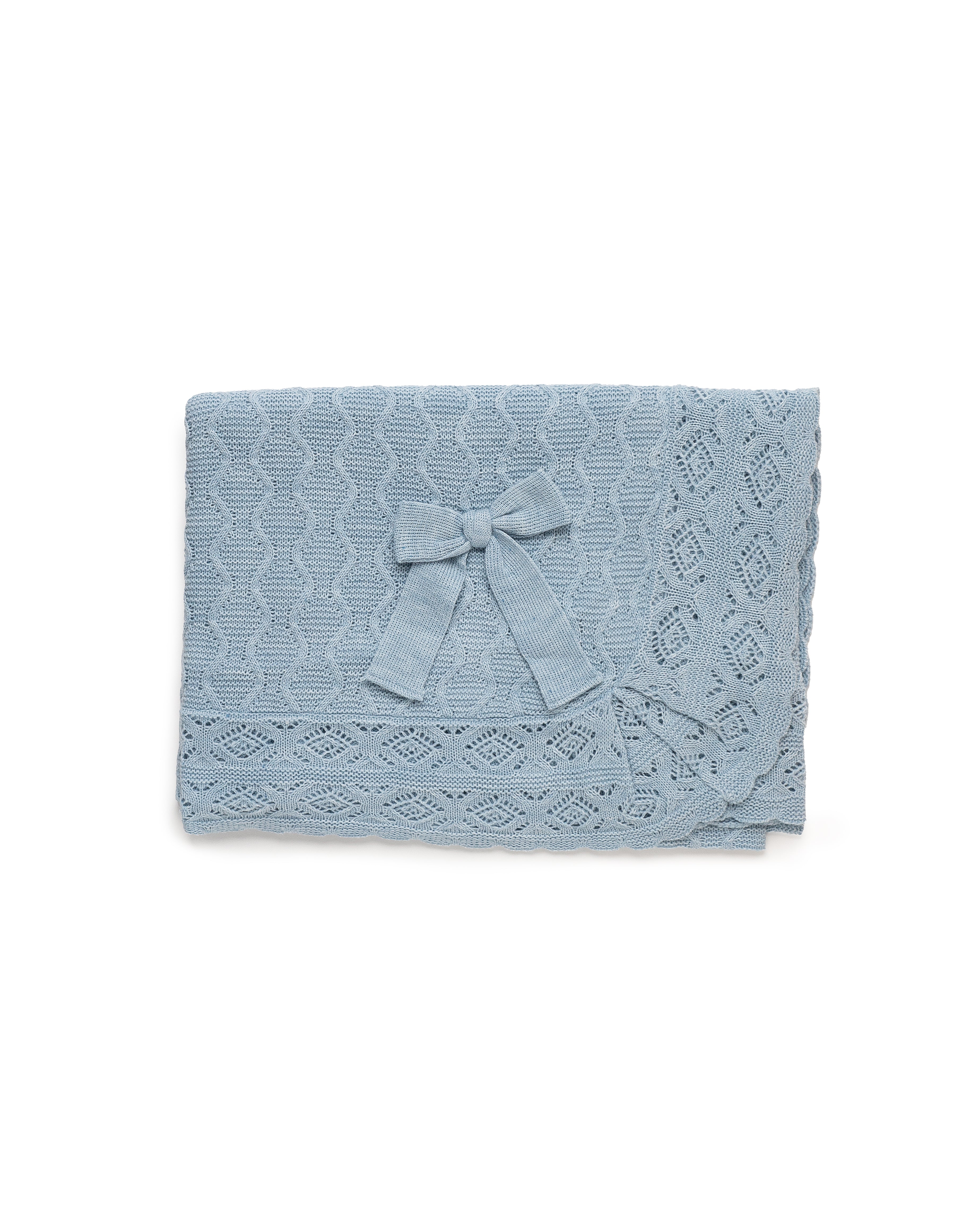Chal de punto con estructura de aranes y volante decorativo con dibujo de rombos. Diseño amplio y envolvente, fácil de colocar sobre el bebé o en el carrito.