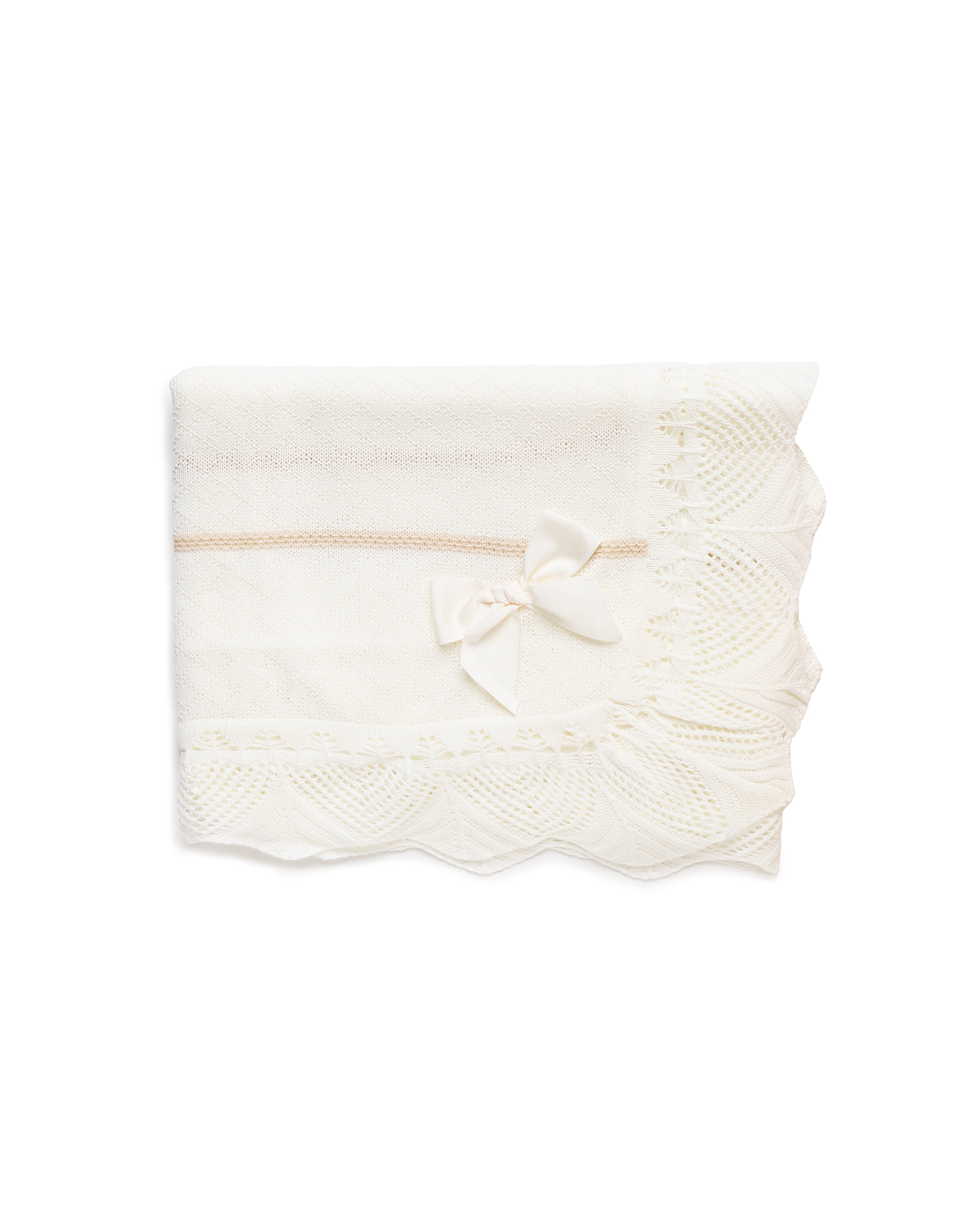 Chal de punto con dibujo de rombos y acabados de vastas combinadas. Remate con volante de picos. Tacto suave y diseño ligero, ideal para entretiempo o para completar conjuntos.