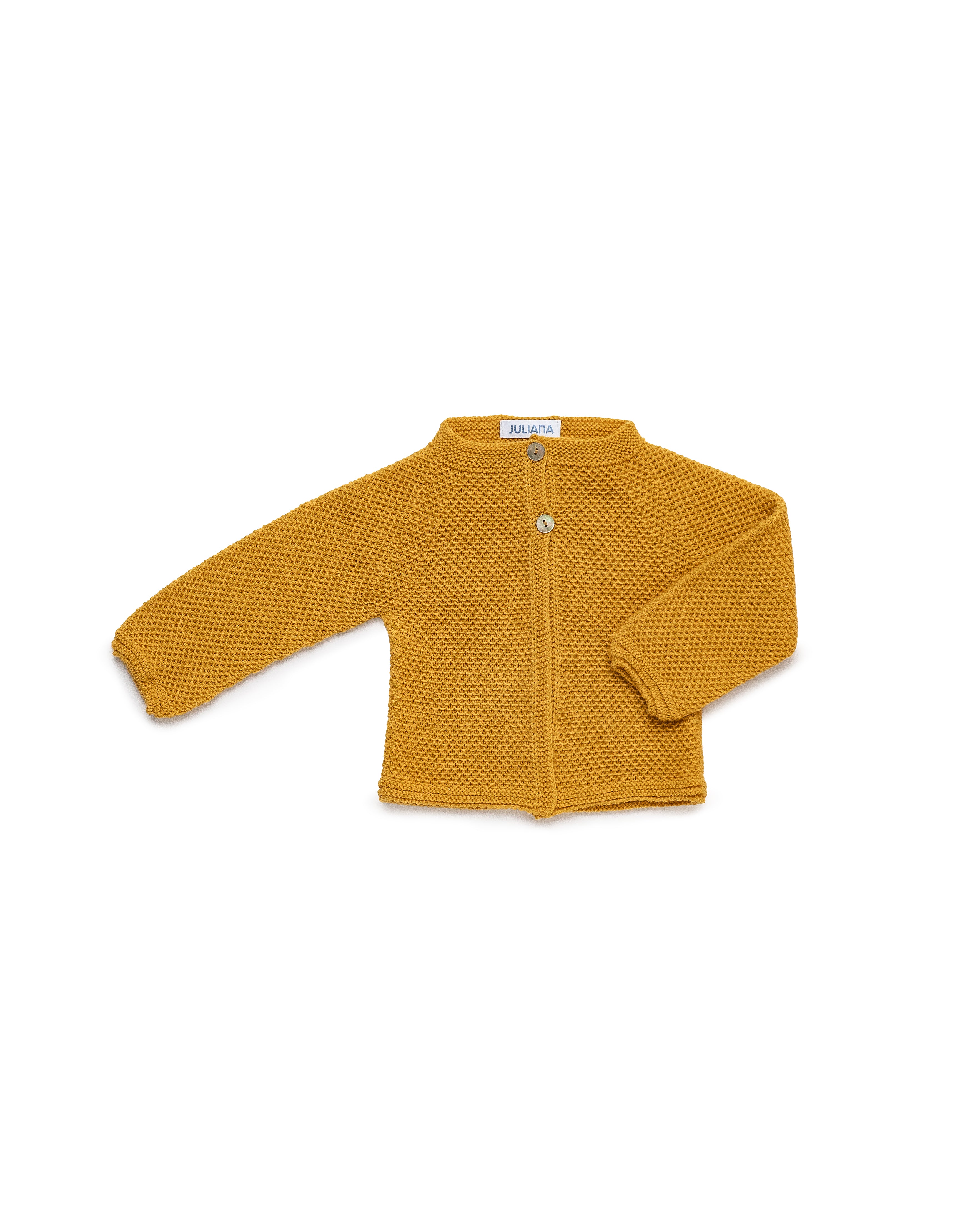 Chaqueta de punto tricot con diseño de recogidas y cierre frontal de dos botones nacarados. Su diseño limpio, con cuello redondo y remates suaves, la convierte en una prenda cómoda y alegre, perfecta para acompañar los primeros paseos con calidez y estilo.