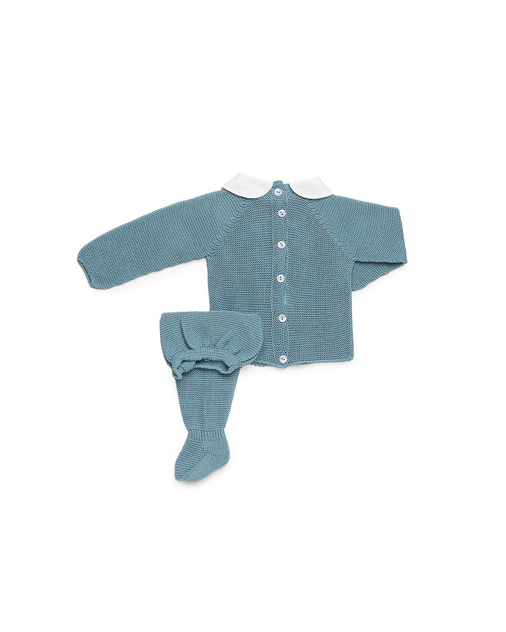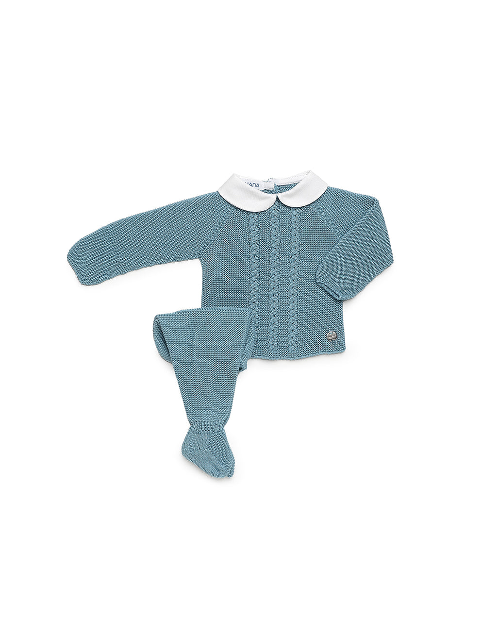 Conjunto de dos piezas con trenzas y detalle en el cuello. Un modelo clásico y elegante para los primeros meses.