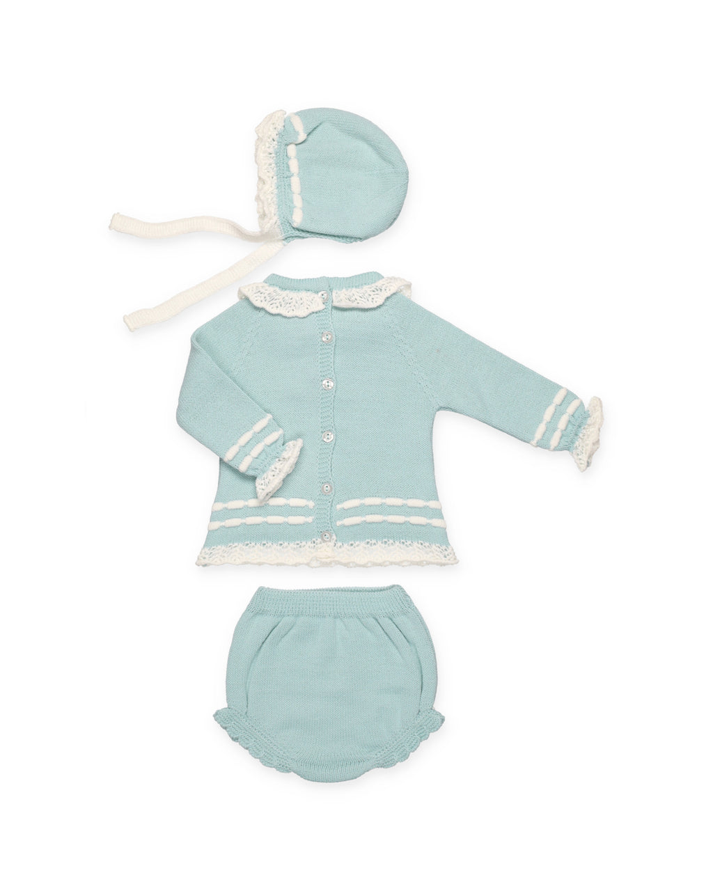 Conjunto de punto con jersey de lorzas y calado en el canesú, ranita de punto liso y gorro a juego.