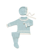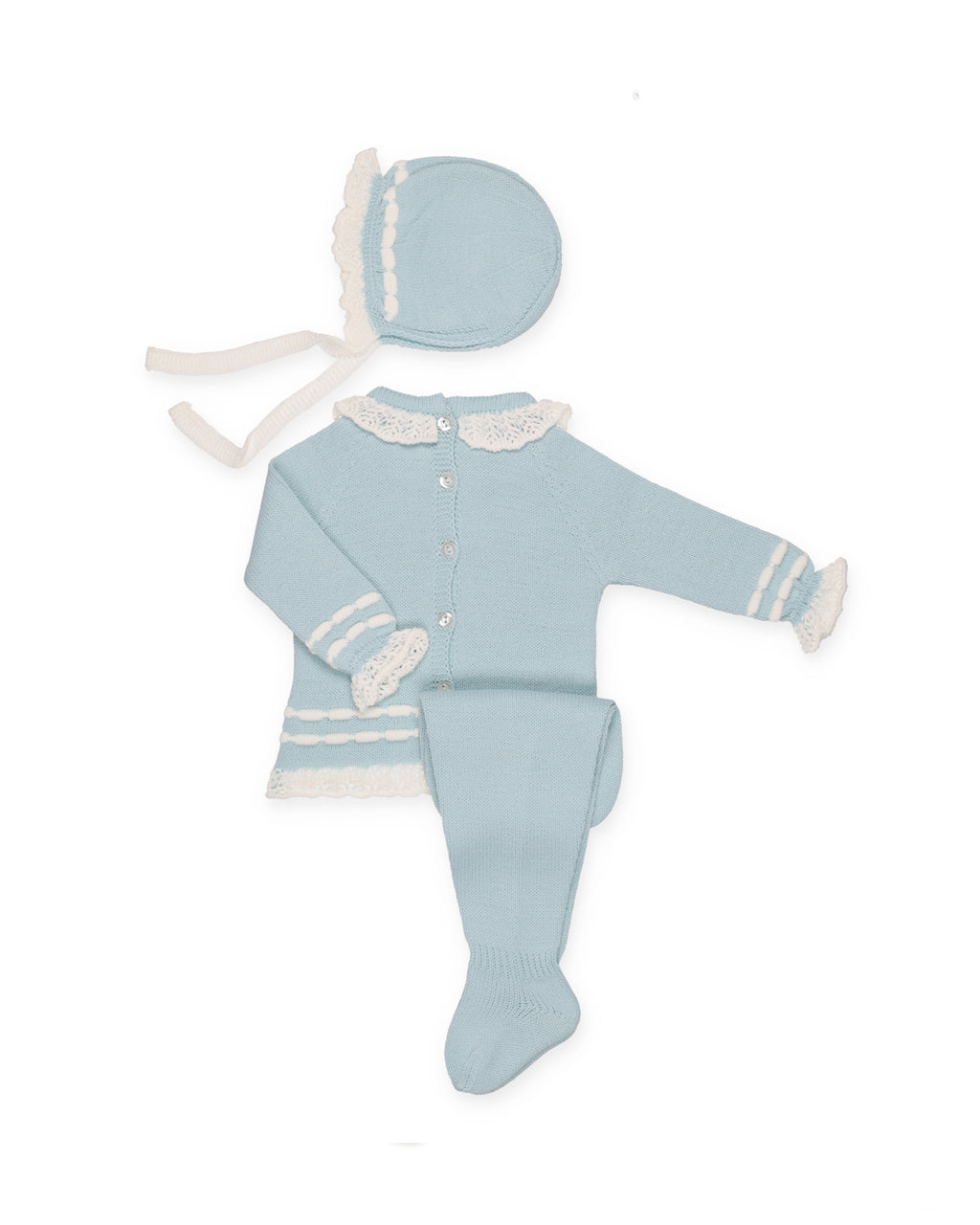 Conjunto con jersey de lorzas en el delantero y detalles calados. Cuello redondo, punto fino y diseño delicado. Incluye polaina y gorro.