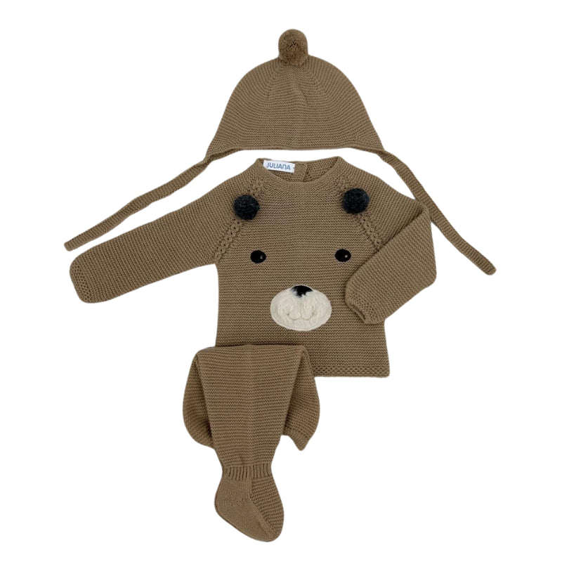 Jersey liso de manga larga con carita de oso bordada y polaina. Gorro liso coordinado. Diseño cómodo con un toque infantil.