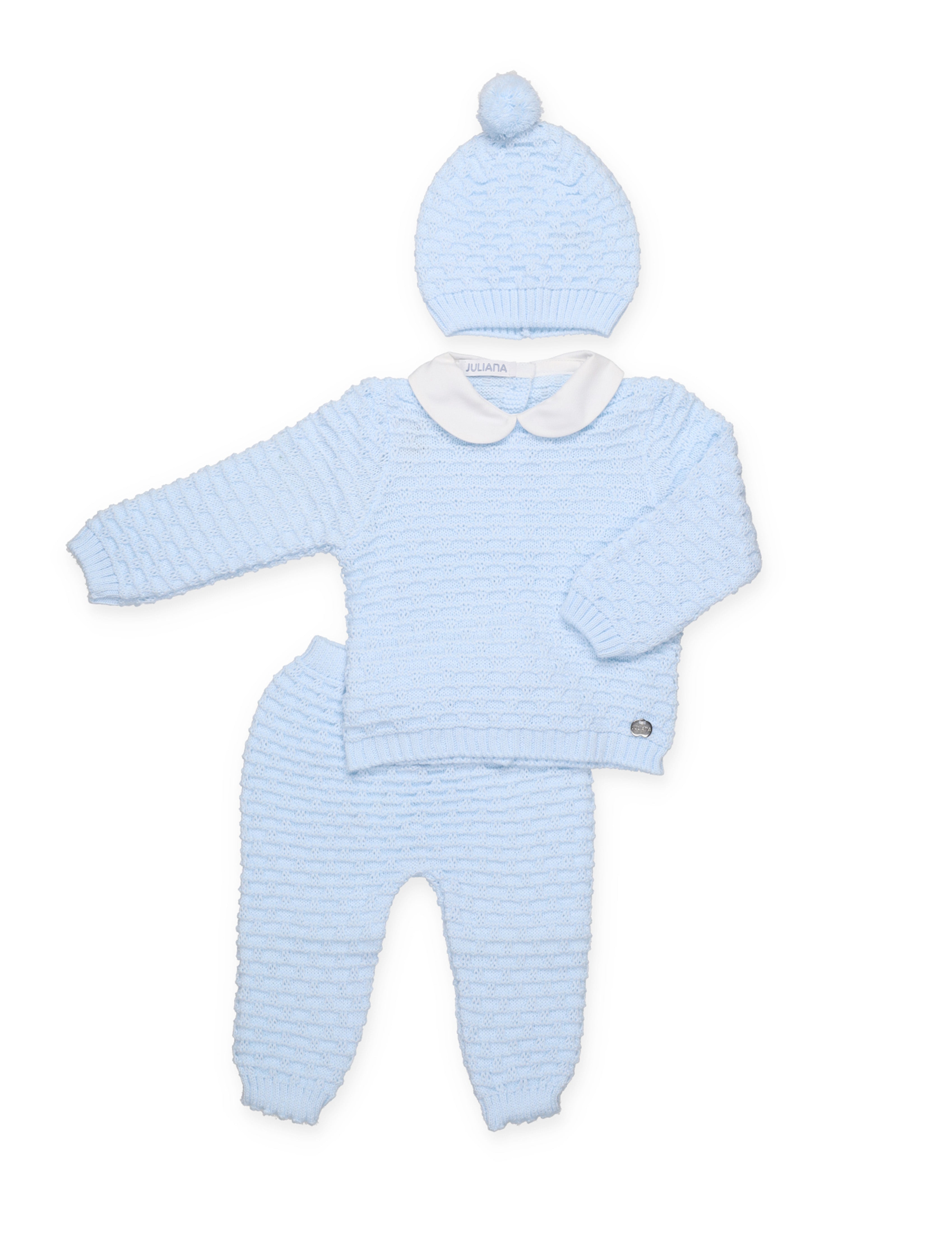 Jersey liso con detalle de vastas decorativas. Cuello redondo de punto. Pantalón y gorro de puto con el mismo diseño de vastas.