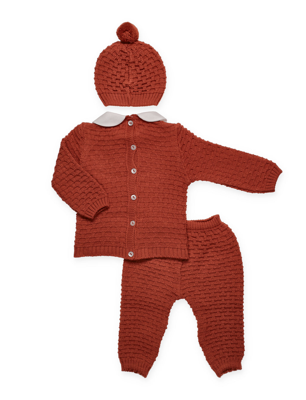 Jersey liso con detalle de vastas decorativas. Cuello redondo de punto. Pantalón y gorro de puto con el mismo diseño de vastas.