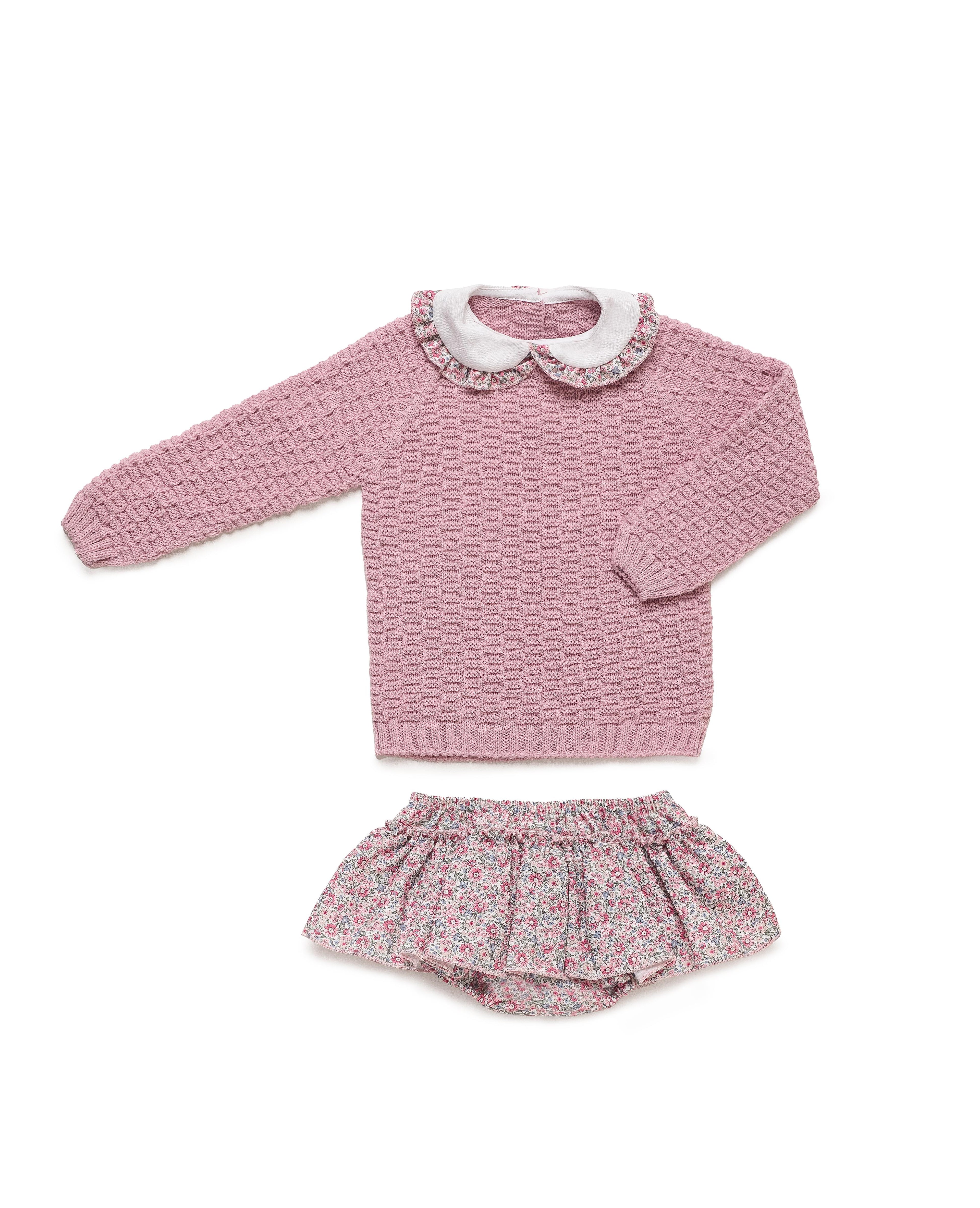 Conjunto de dos piezas. Jersey de punto con estructura en tono rosa maquillaje y cuello bebé en tejido liso con volante de estampado floral. Ranita con volante a juego en el mismo tejido estampado.